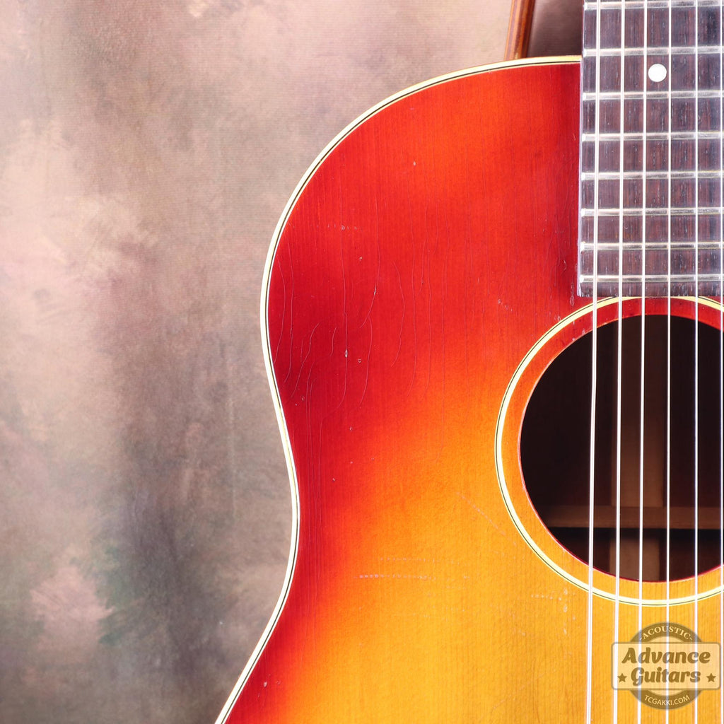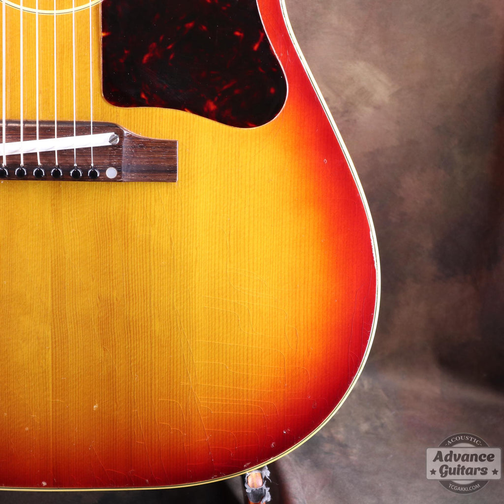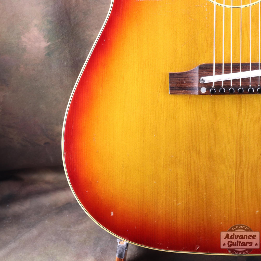 The round spruce body features a cherry sunburst finish, with cherry tones along the body's contours transitioning to yellow hues toward the center.