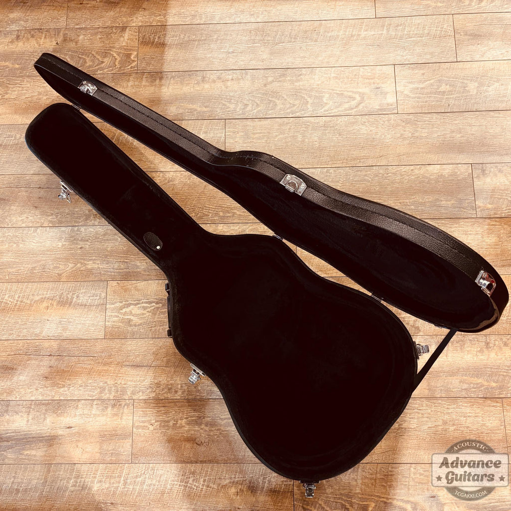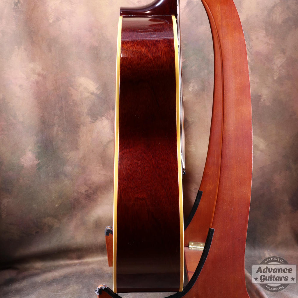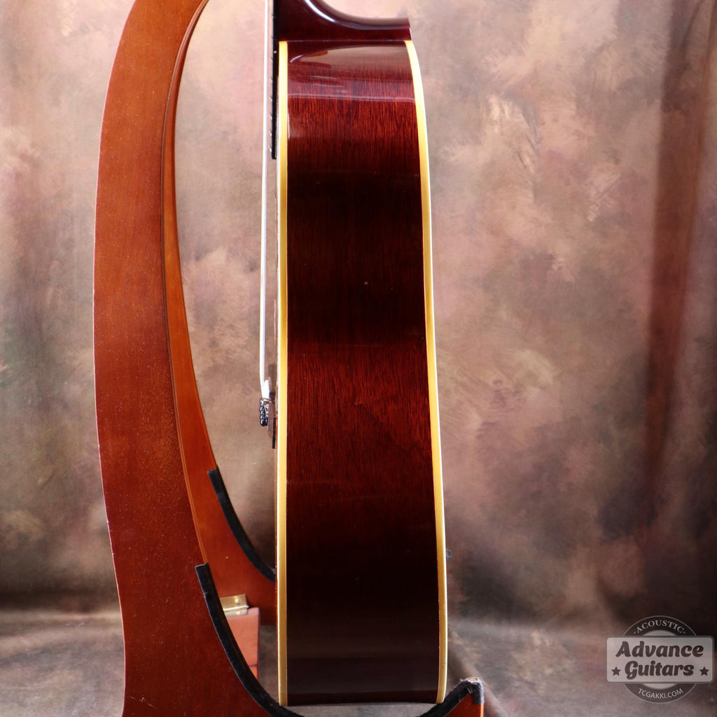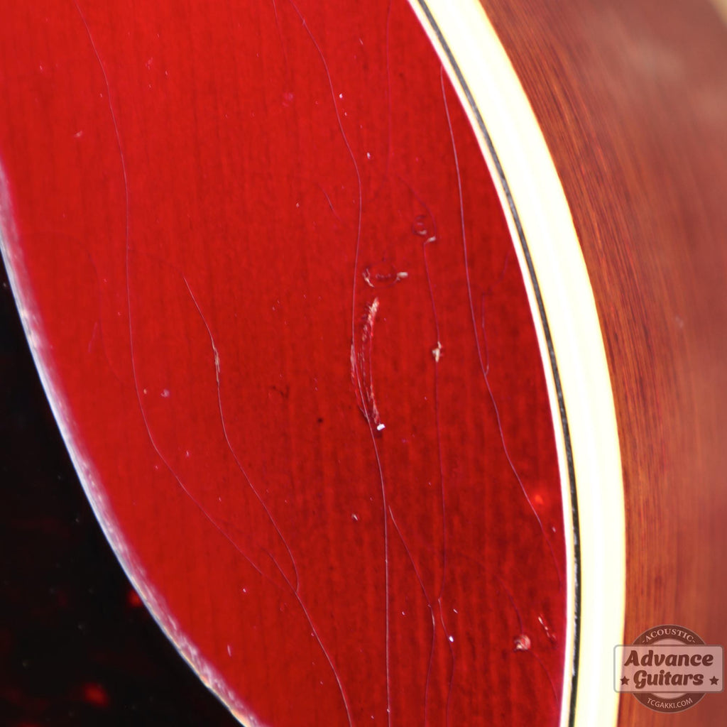 The round spruce body features a cherry sunburst finish, with cherry tones along the body's contours transitioning to yellow hues toward the center.
