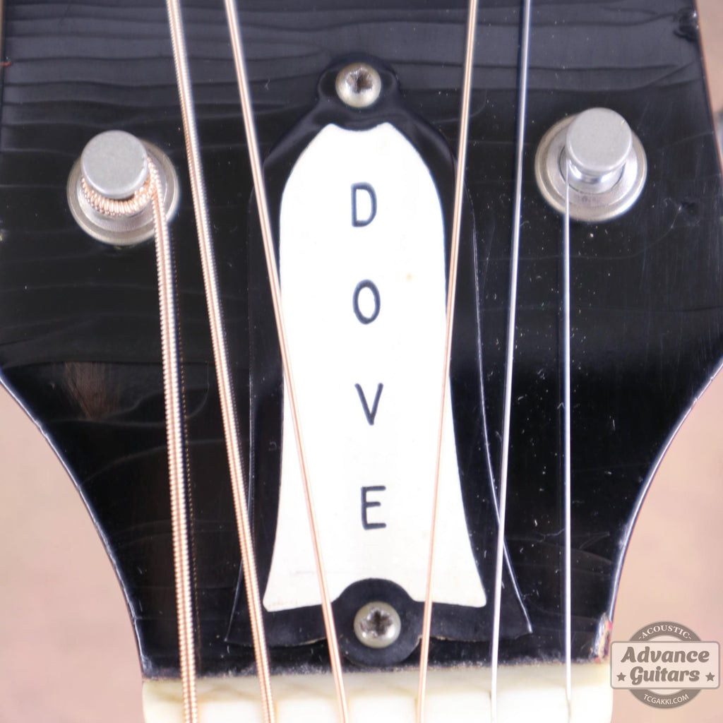 The bell-shaped truss rod cover has a black frame, a white center, and the word "Dove" inscribed.