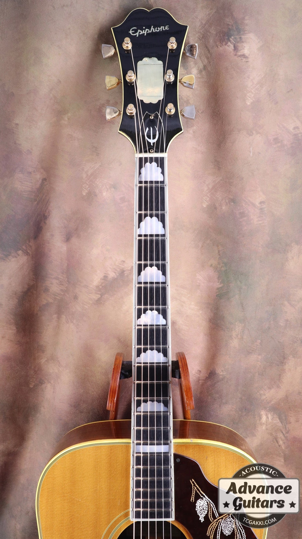 The headstock, particularly large and prominent even among Epiphones, features the Epiphone logo alongside a large cloud inlay, seemingly signifying a higher-end model.