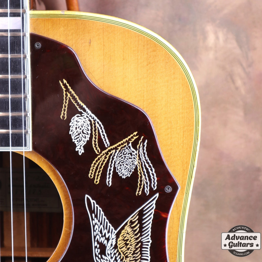 The large tortoiseshell-patterned pickguard, molded to follow the body's contours, features a dynamic sculpture of an eagle perched on a branch. Complementing this is a sculpture resembling a fir tree cone. The carvings are colored with white and yellow ink, applied in a grained finish to create a sense of shadow and depth.