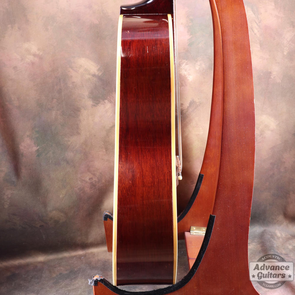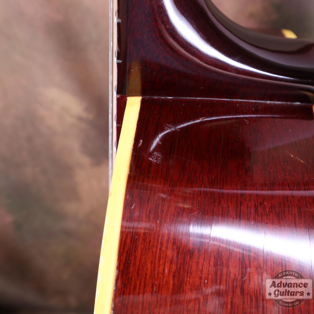 Mahogany is used for the sides and back, finished with a reddish lacquer to match the top's coloring.