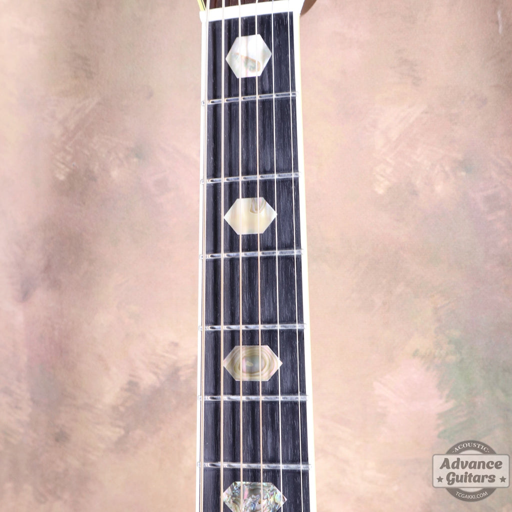 The fingerboard is ebony, featuring hexagonal inlays showcasing the expressive beauty of abalone.