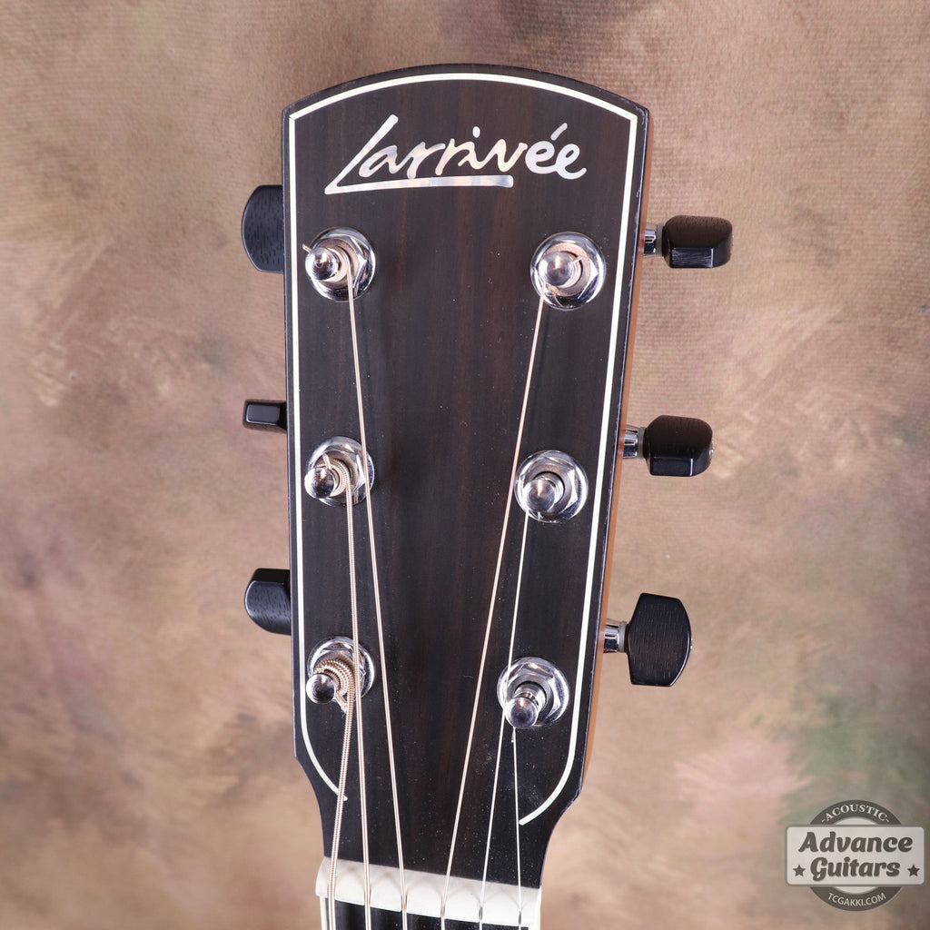 Schaller M6 tuners with the Larrivee logo are fitted, and the ebony buttons add a touch of sophistication.