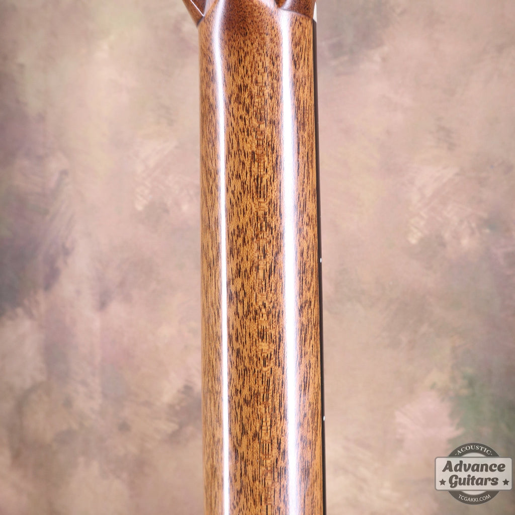 The herringbone trim and long saddle give it a pre-war style look. The beautiful striped Guatemalan rosewood, reminiscent of Brazilian rosewood, creates a luxurious, eye-catching instrument. It produces a rich, deep bass tone that resonates beautifully.