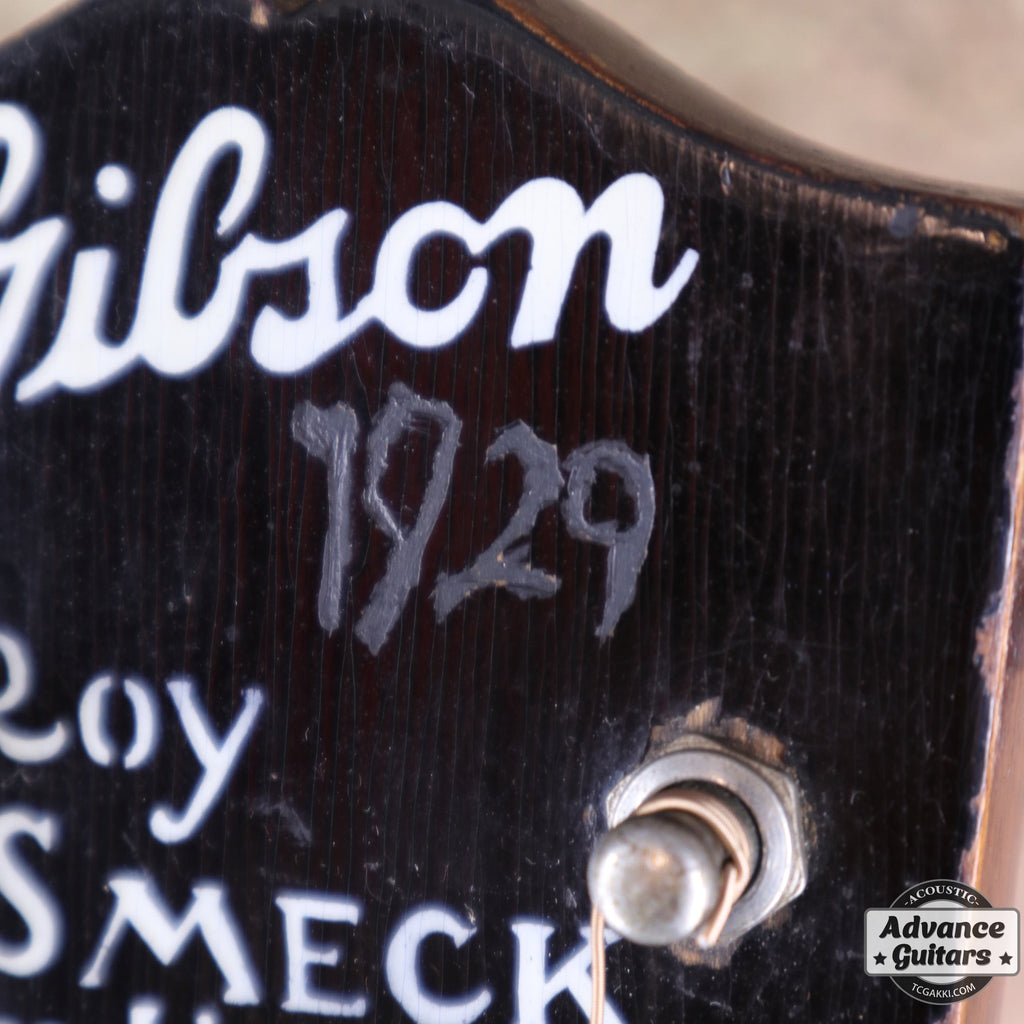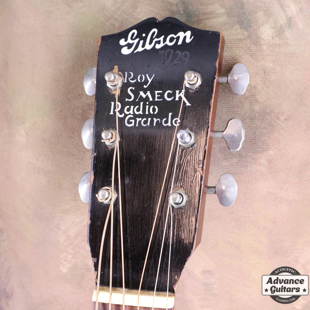 El clavijero lleva el logotipo de Gibson en tinta blanca, junto con los nombres Roy Smeck y Radio Grande.