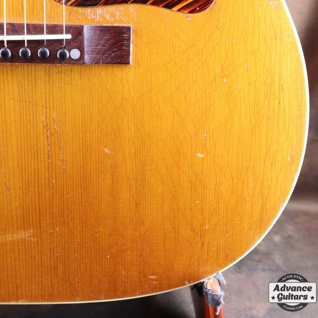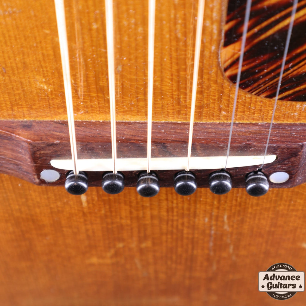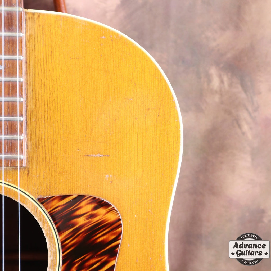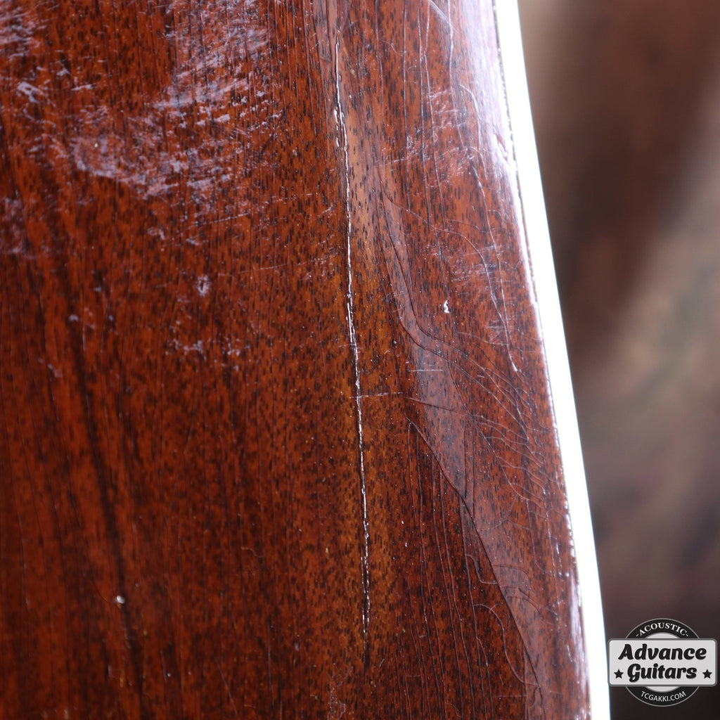 El cuerpo de abeto con hombros redondeados, que recuerda al J-45, lleva las marcas de casi 90 años de uso: arañazos, abolladuras y grietas le dan un aspecto digno.