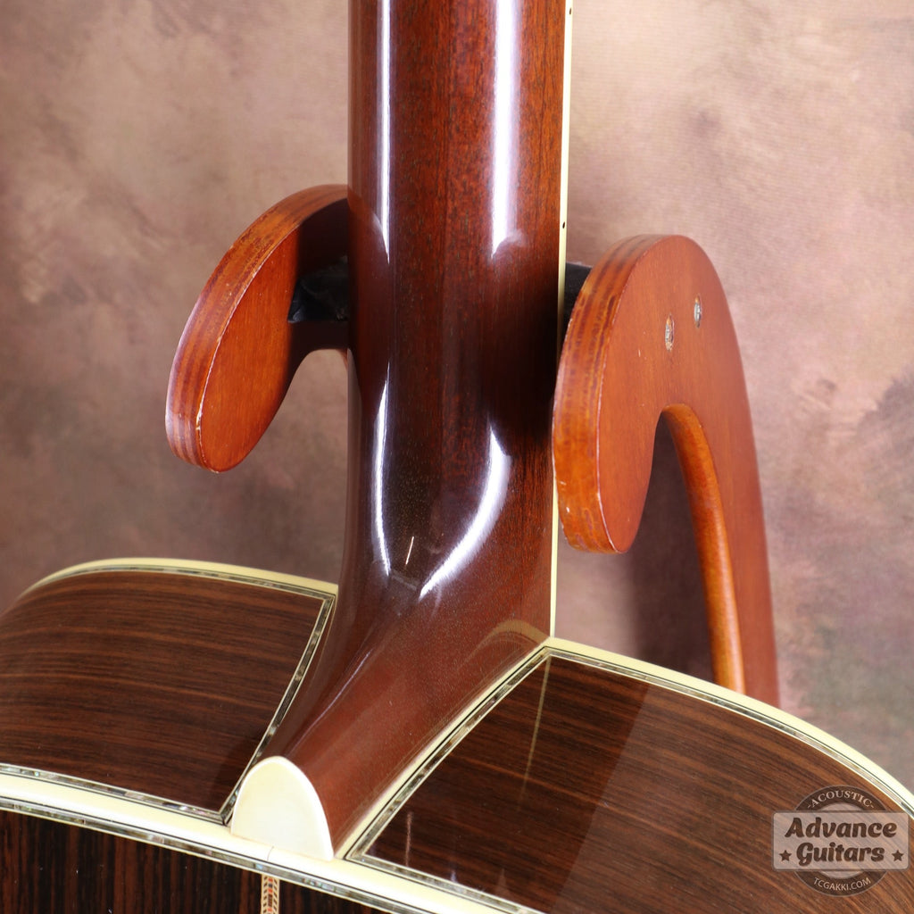 1985 marcó el último año de la varilla cuadrada. En 1986, las especificaciones pasaron a la varilla ajustable, lo que permitía ajustar la afinación. Este instrumento en particular es un modelo de 1985 con varilla ajustable. Se puede ver el orificio de acceso a la varilla, situado lejos de la boca de la guitarra.