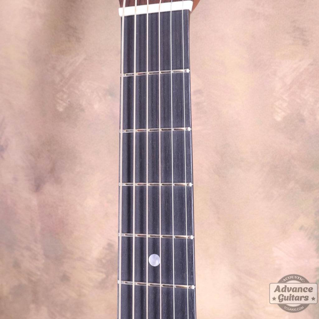 El diapasón está fabricado con ébano negro azabache y cuenta con marcadores de posición con puntos de concha.