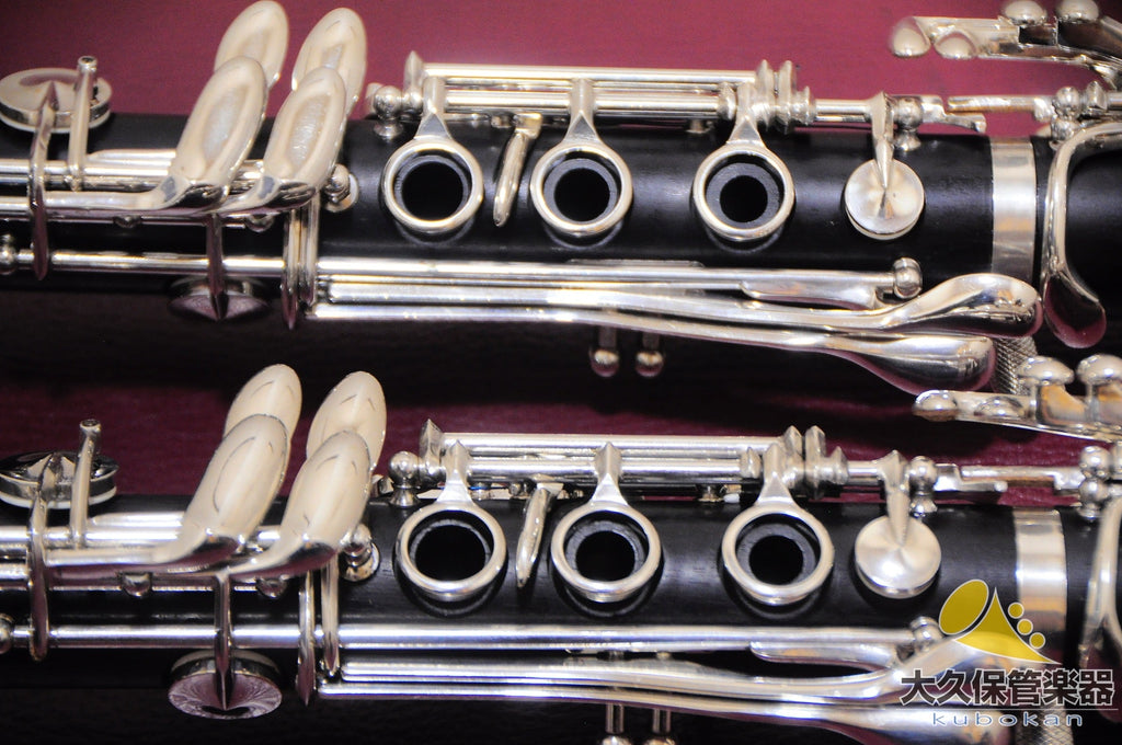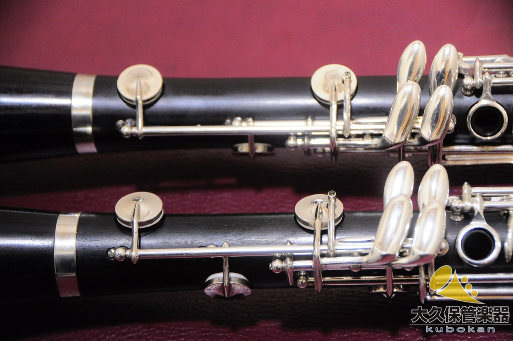Clarinetes Boosey & Hawkes Symphony 1010 series B♭ y A. Cuerpo de madera de granadilla. Llaves plateadas. Fabricados alrededor de 1980. Accesorios: estuche rígido doble original (costuras exteriores desgastadas y deshilachadas), boquilla (Vandoren B45), ligadura, tapa (original).