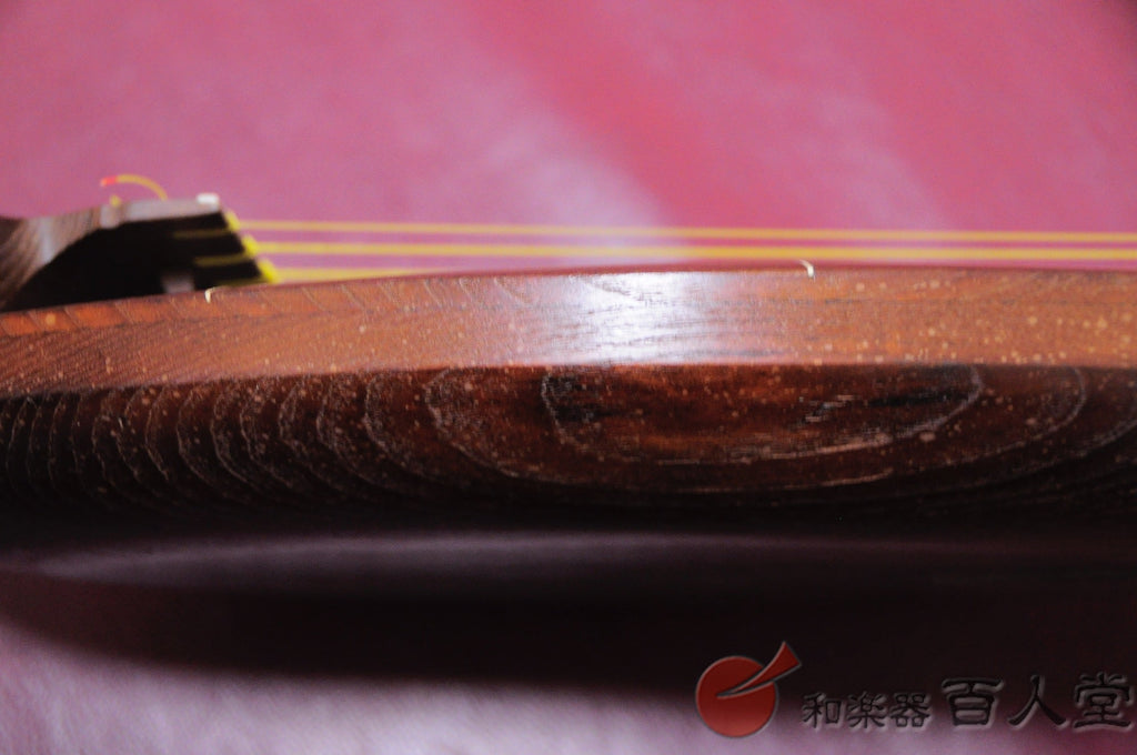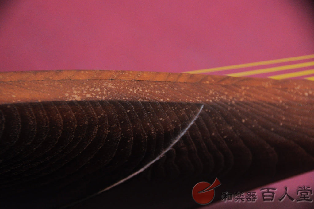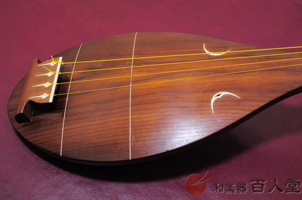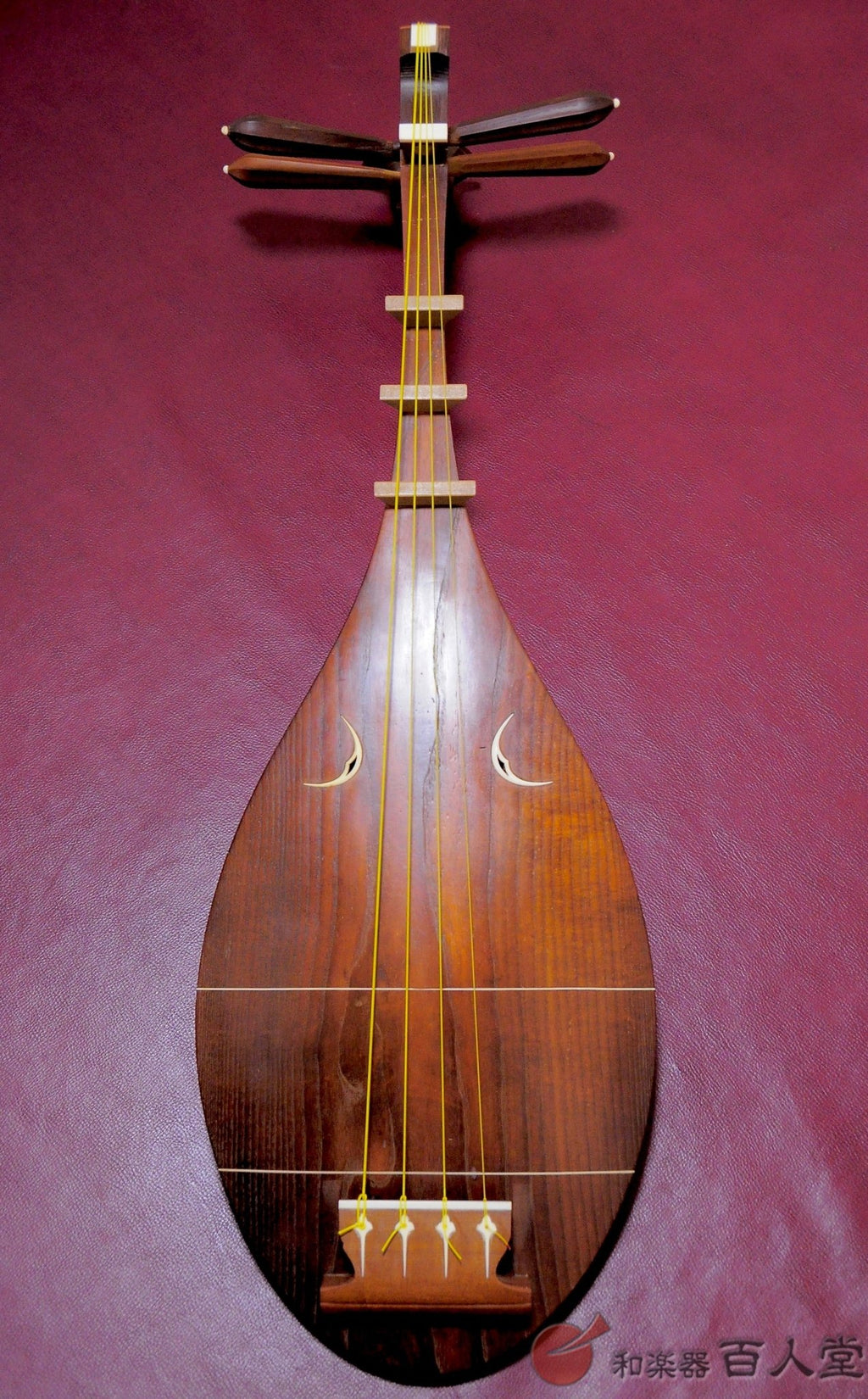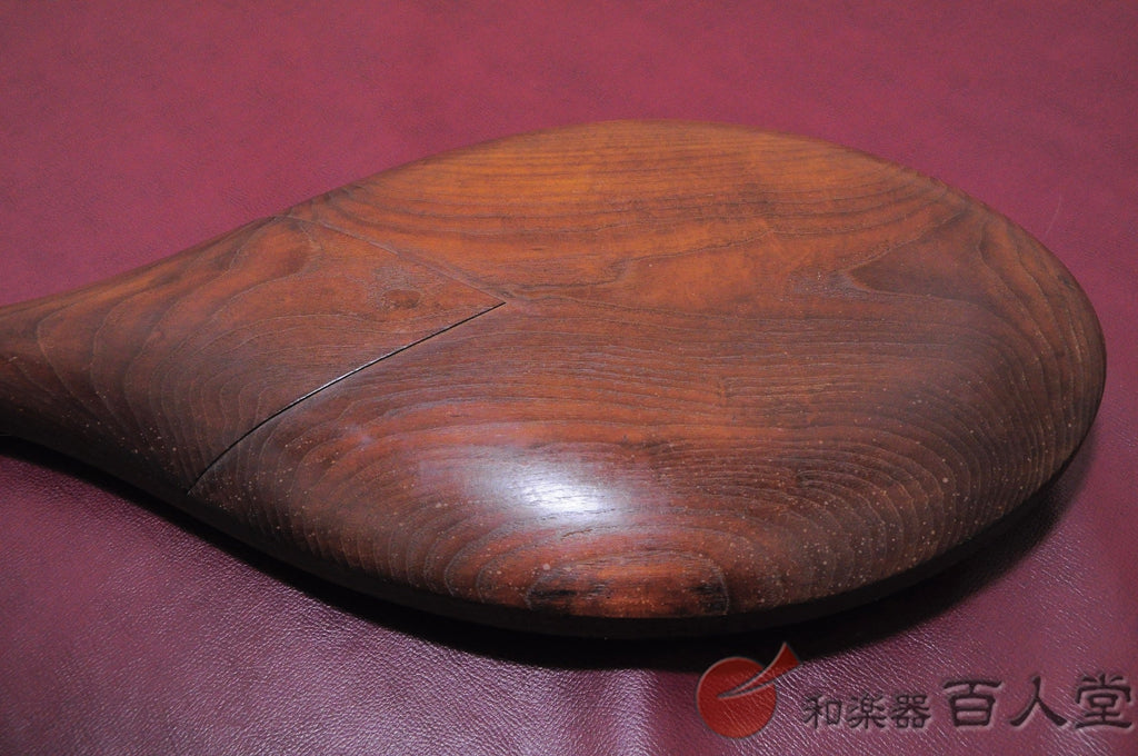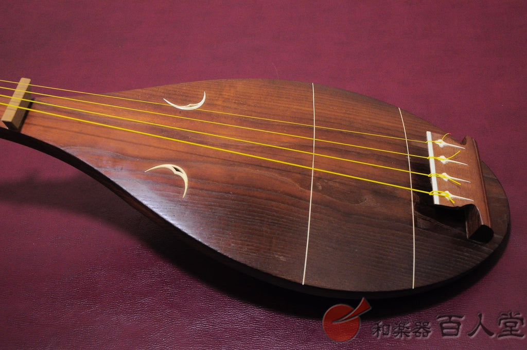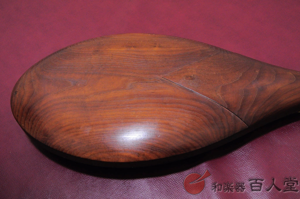 Una biwa satsuma de morera total hecha por Usuke Hayashi, un moderno intérprete de biwa y reconocido maestro artesano. La panza y las placas traseras, que determinan el tono de la biwa, permanecen como estaban cuando se fabricó el instrumento. Después de más de 100 años, se ha vaciado completamente de agua, pero sigue pesando 3,4 kg. La calidad de la madera de morera de Kagoshima, que actualmente no está disponible, es evidente. No se ha podido tocar durante algún tiempo, por lo que la impresión actual es que el sonido es un poco interior, pero el tono profundo con peso es excepcional. Es una joya que se puede disfrutar del sonido cambiante al tocarla a partir de ahora.El mástil ha sido cuidadosamente restaurado y ajustado como instrumento musical por un moderno fabricante de biwas, incluyendo su cuello retorcido, por lo que es perfecto como instrumento.