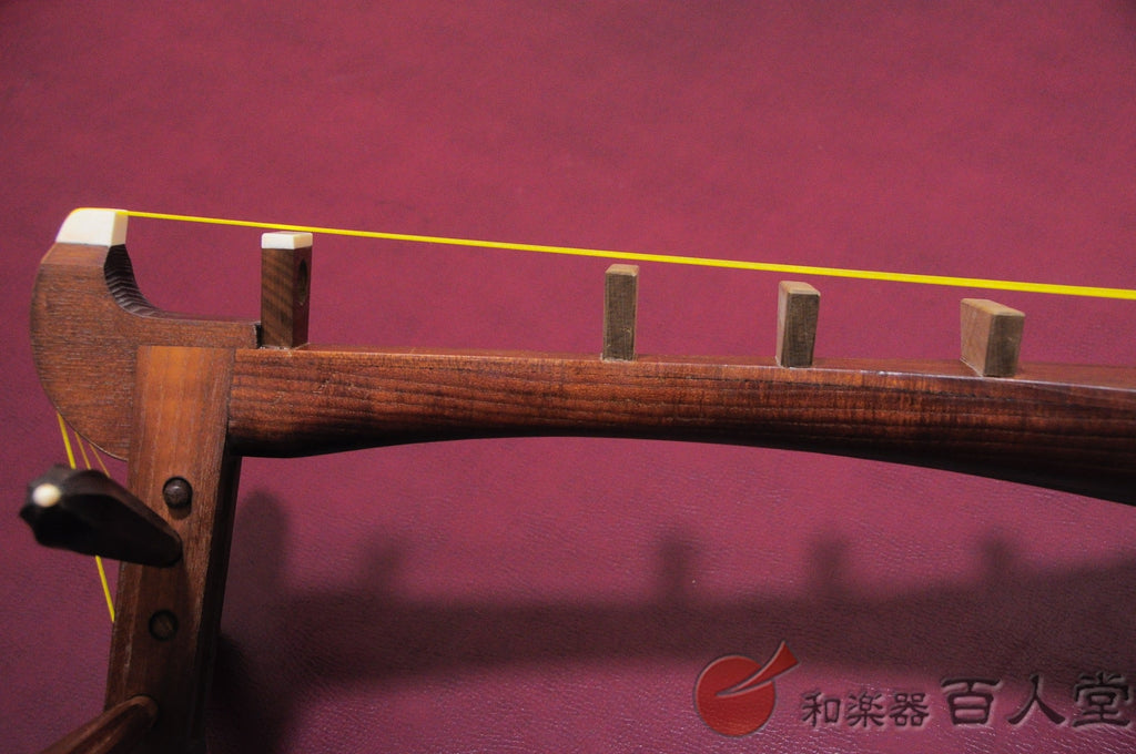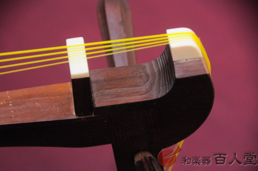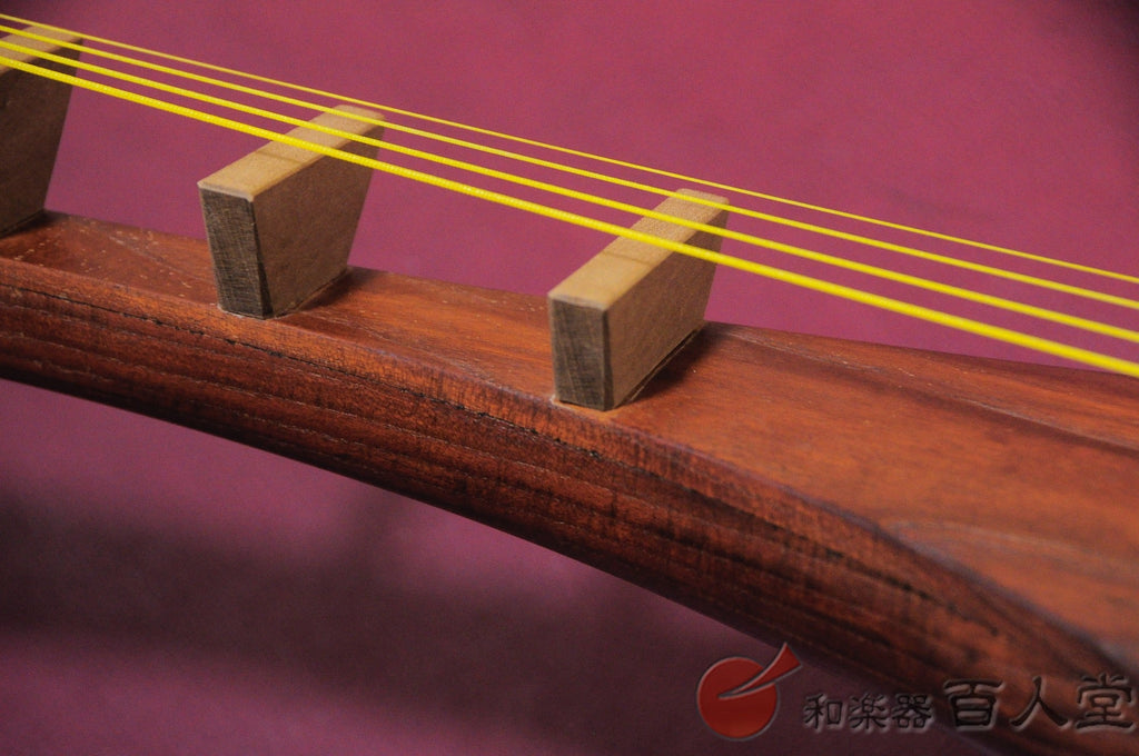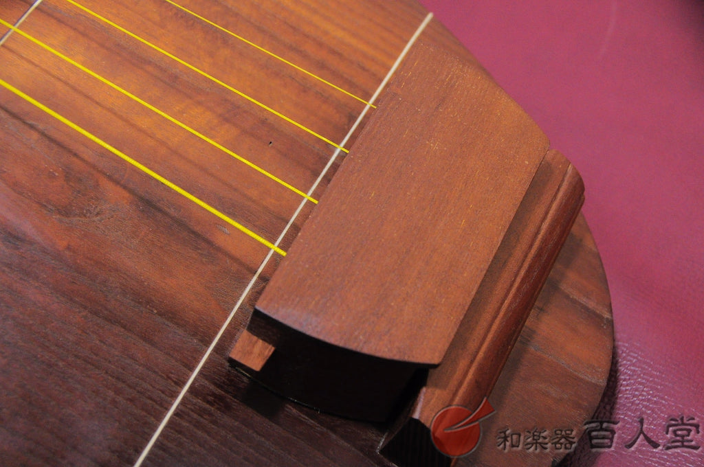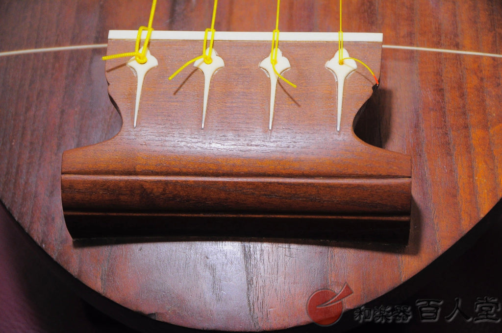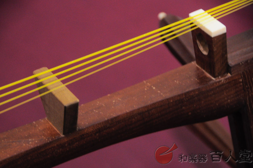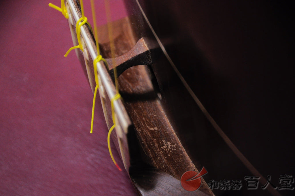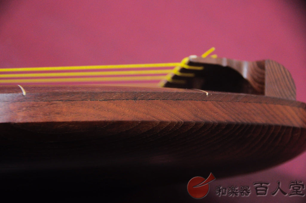 La mano que cubre, el jinin que enrolla y los dos rollos de hilo (dos de colores vivos) se basan en los originales,fielmente reproducidos y fabricados con madera vieja de morera de la prefectura de Kagoshima, de unos 100 años de antigüedad.La parte ebio del tengin faltaba antes de la restauración, pero el taller de biwa que trabajó en ella pudo restaurarla".La restauración se llevó a cabo tomando como referencia el biwa "Ringetsu", propiedad del Estudio Biwa, responsable de la restauración. Ajuste de la torsión del cuello,Se ajustó la torsión del cuello, la boca de marfil (procesada a partir de marfil de segunda mano), se sustituyó el toriguchi por bambú de hollín, se ajustó e instaló la altura del pilar dahoshi, se sustituyó el pilar y se ajustó el tacto,Media luna lado derecho pedido especial, todos los hilos reemplazados. (No hay garantía después de la compra, incluyendo la rotura del hilo. Por favor, comprenda esto de antemano).