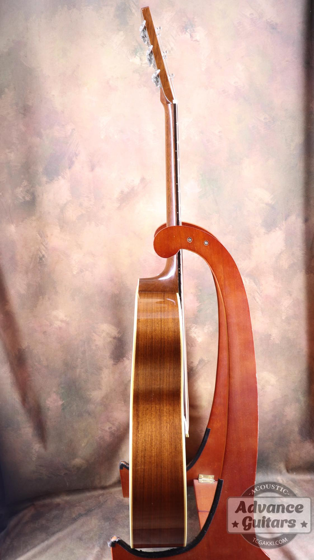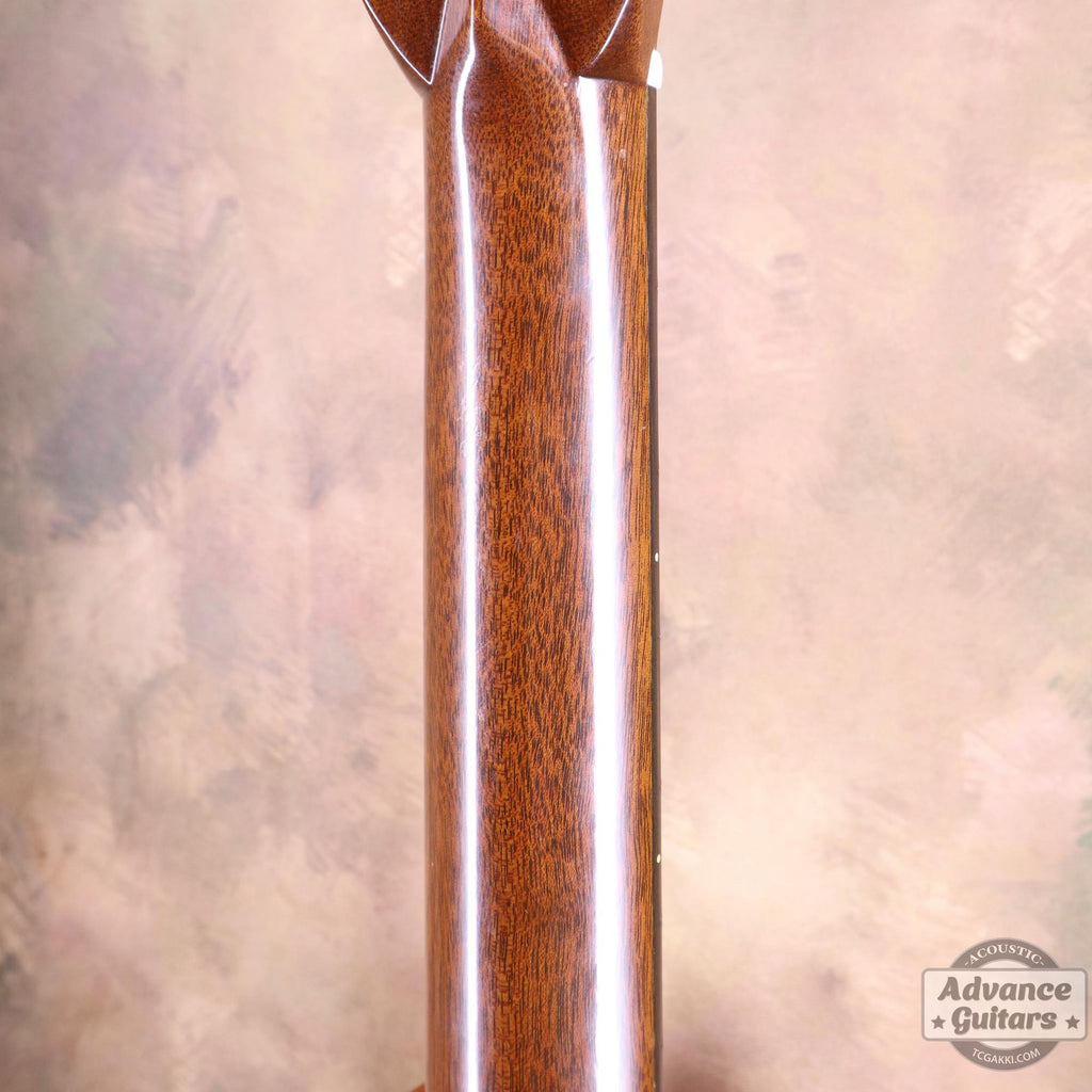 El mástil de caoba, posiblemente la característica más definitoria del instrumento, parece tener una forma de V ligeramente más gruesa.