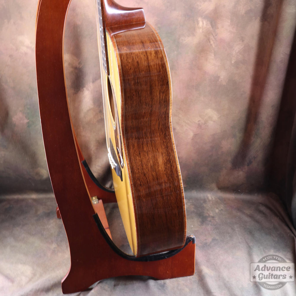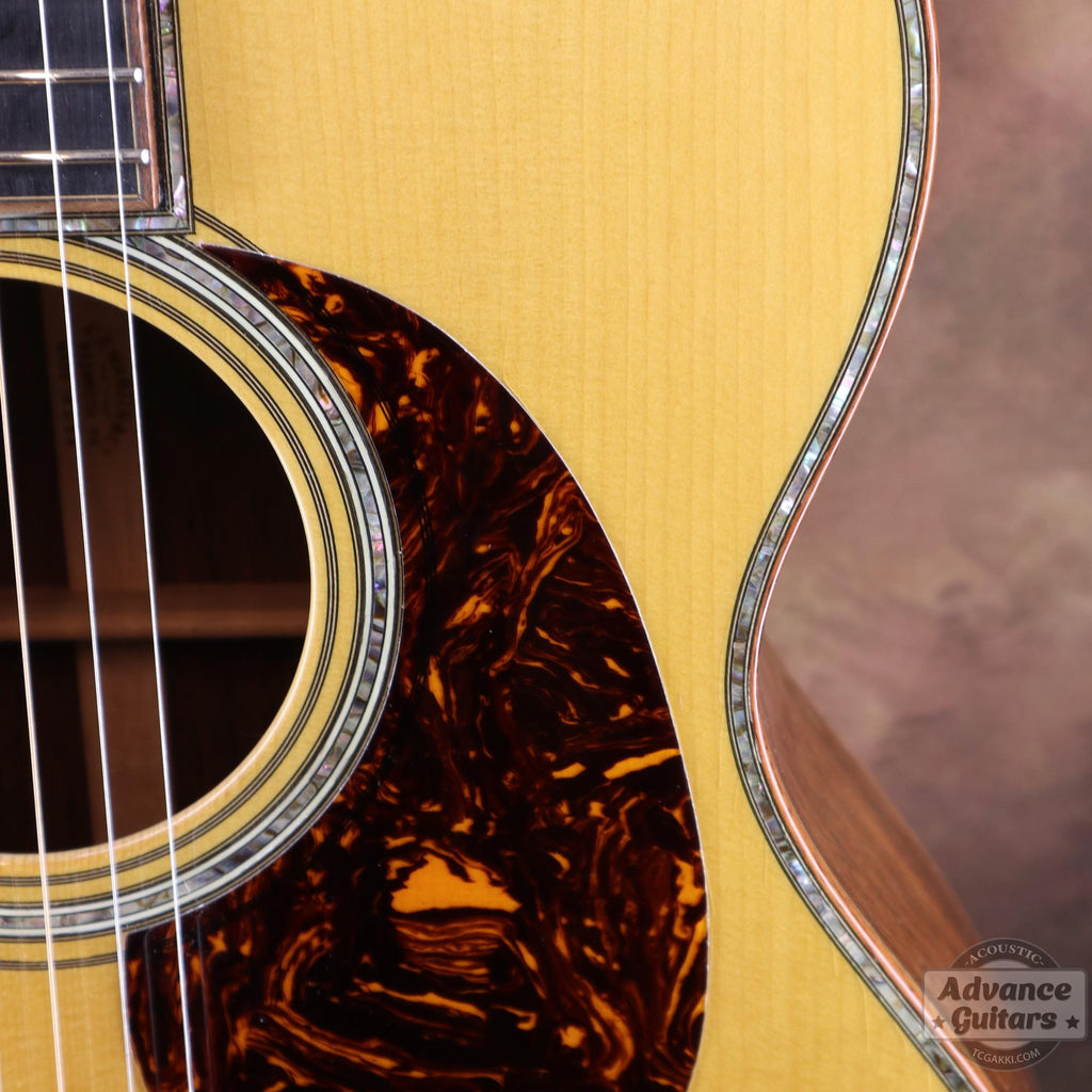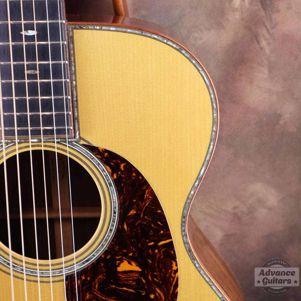 El cuerpo de tamaño 000 está fabricado con abeto Adirondack con un veteado hermoso y uniforme. Está adornado con incrustaciones de concha de abulón y ribetes de koa hawaiano que muestran un veteado exquisito.