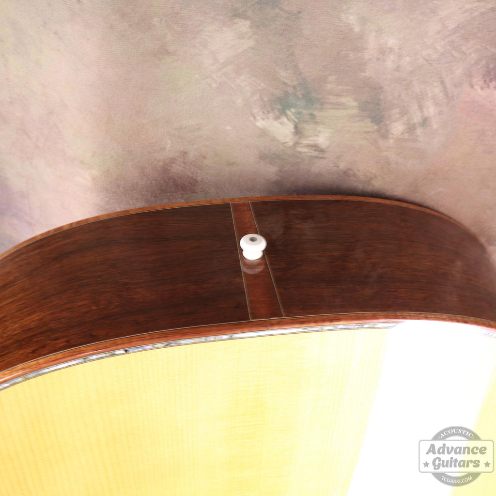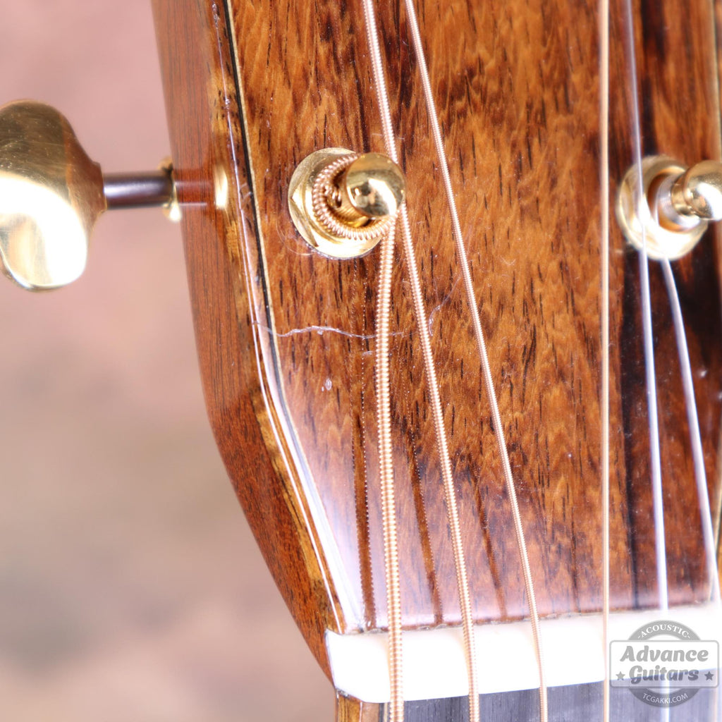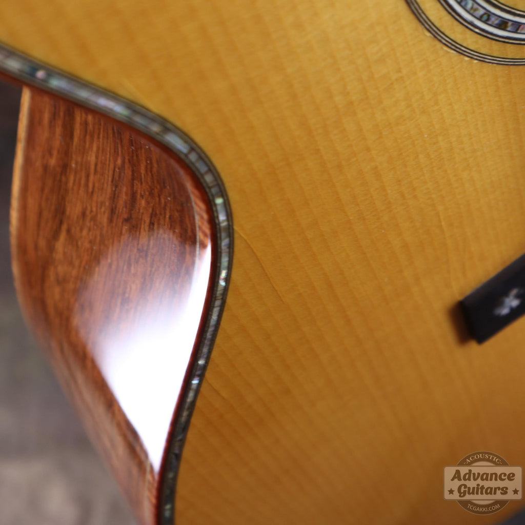 El cuerpo de tamaño 000 está fabricado con abeto Adirondack con un veteado hermoso y uniforme. Está adornado con incrustaciones de concha de abulón y ribetes de koa hawaiano que muestran un veteado exquisito.