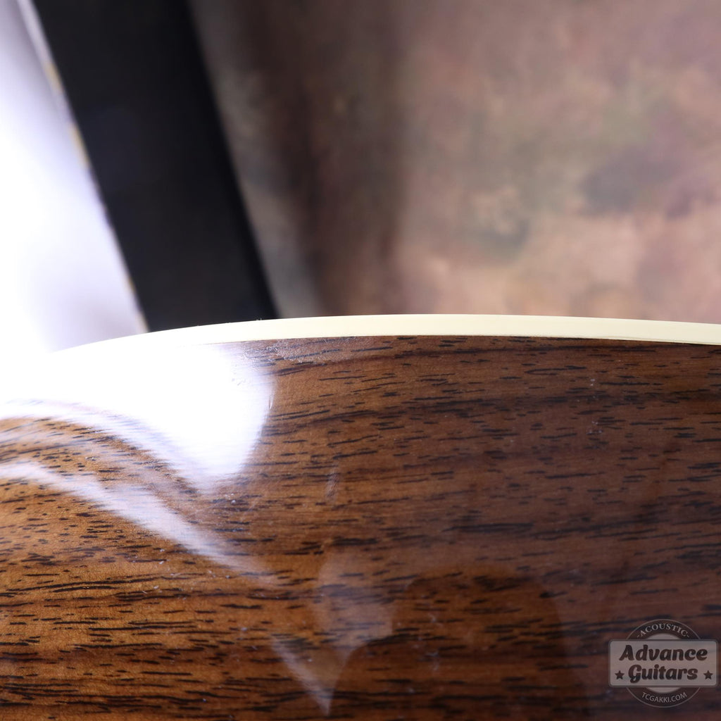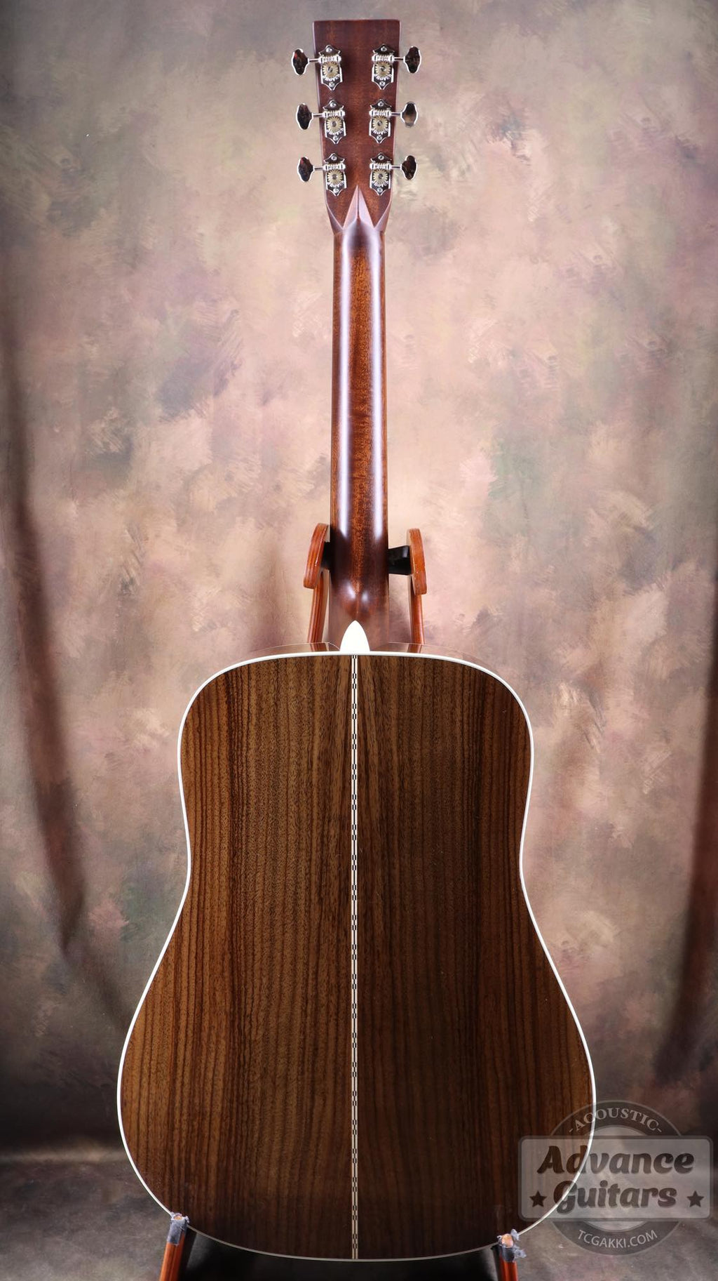 Los aros y el fondo están fabricados en palisandro indio aserrado al cuarto, con una tira trasera con diseño a cuadros.