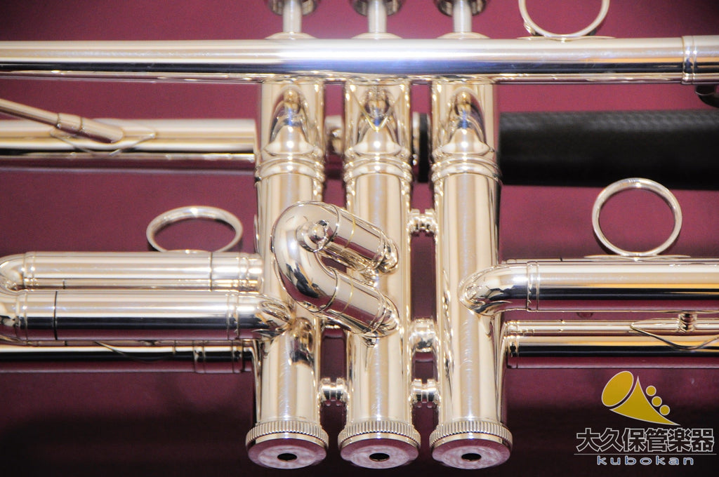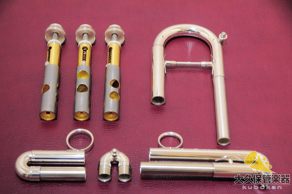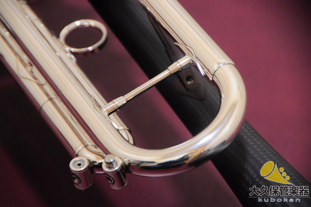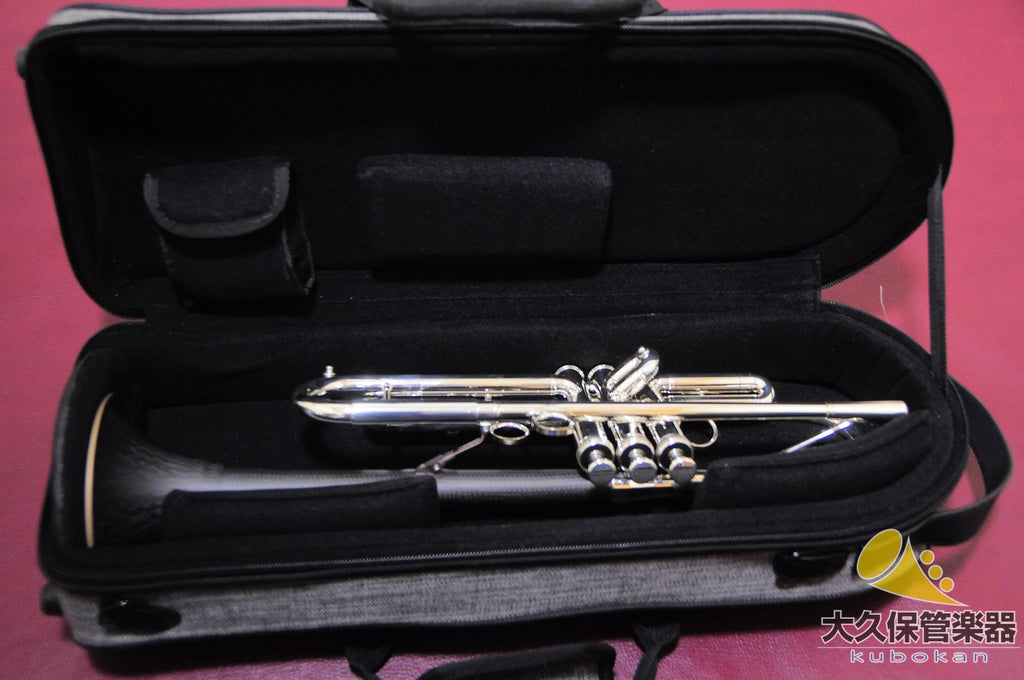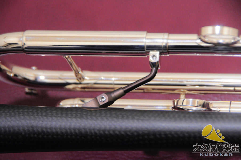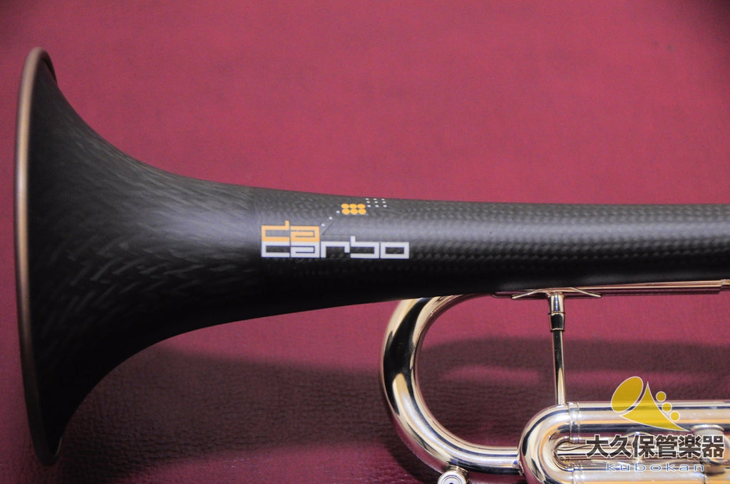 daCarbo B♭ Trompeta Unica. Campana de carbono de 128 mm. Latón amarillo desde el arco trasero de la campana hasta la base de la campana. La sección de la campana y el cuerpo de latón amarillo presentan un acabado plateado. Llave de agua Amado, varilla de afinación inversa. Diámetro interior de 11,7 mm. Peso del instrumento: 1033 gramos.Accesorios: Estuche semirrígido usado (KIKUTANI/Tweed Grey). Precio actual nuevo: 814 000 yenes.