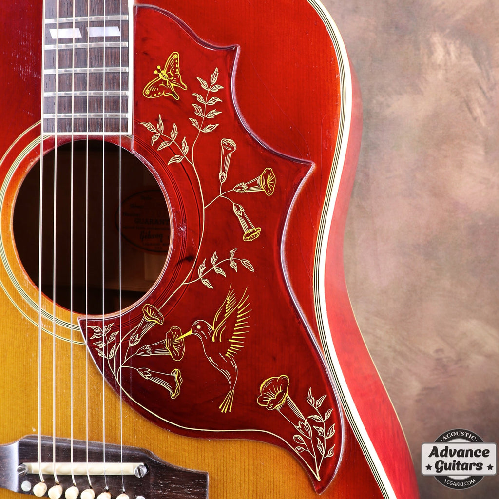 Ce modèle utilise de l'érable au grain magnifique pour les côtés et le dos, au lieu de l'acajou. Cela est lié à la Dove, dont la production a commencé en 1962. À l'époque, le prix de la Dove, qui était le modèle haut de gamme, était 35 % plus élevé que celui de la Hummingbird. C'est pourquoi, après 1962, la Hummingbird est restée très populaire et la production n'arrivait plus à suivre la demande. Il existe donc une anecdote selon laquelle la Dove, qui avait la même taille de corps, aurait été réutilisée comme corps de la Hummingbird.