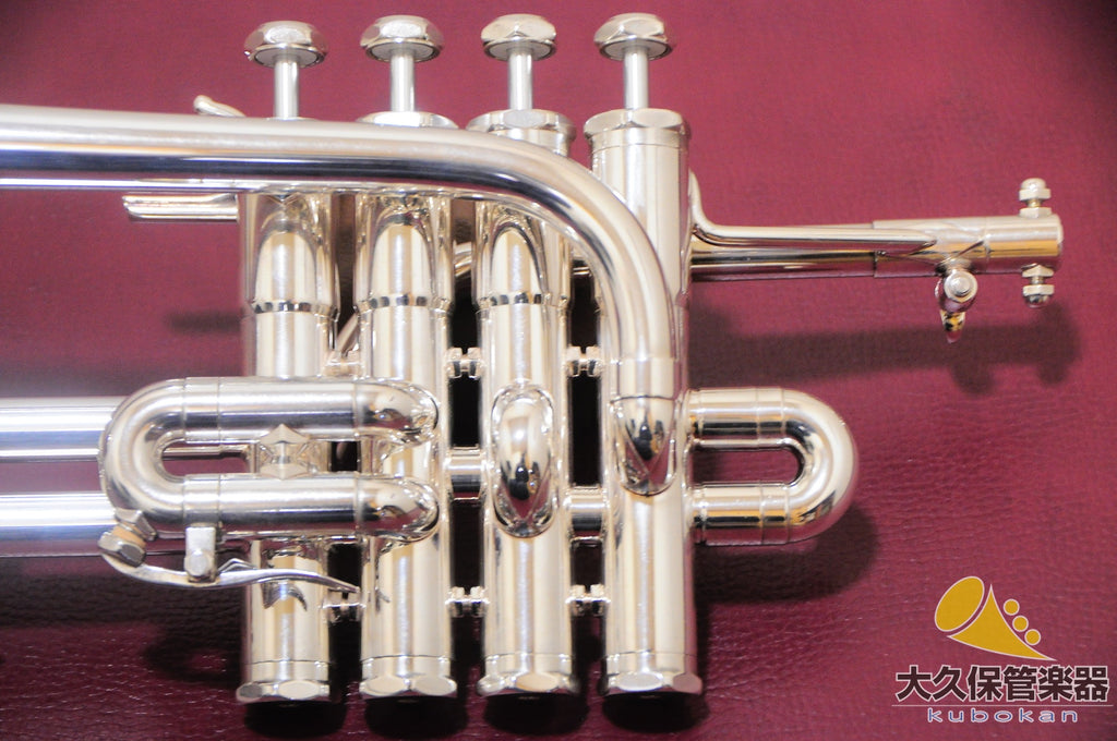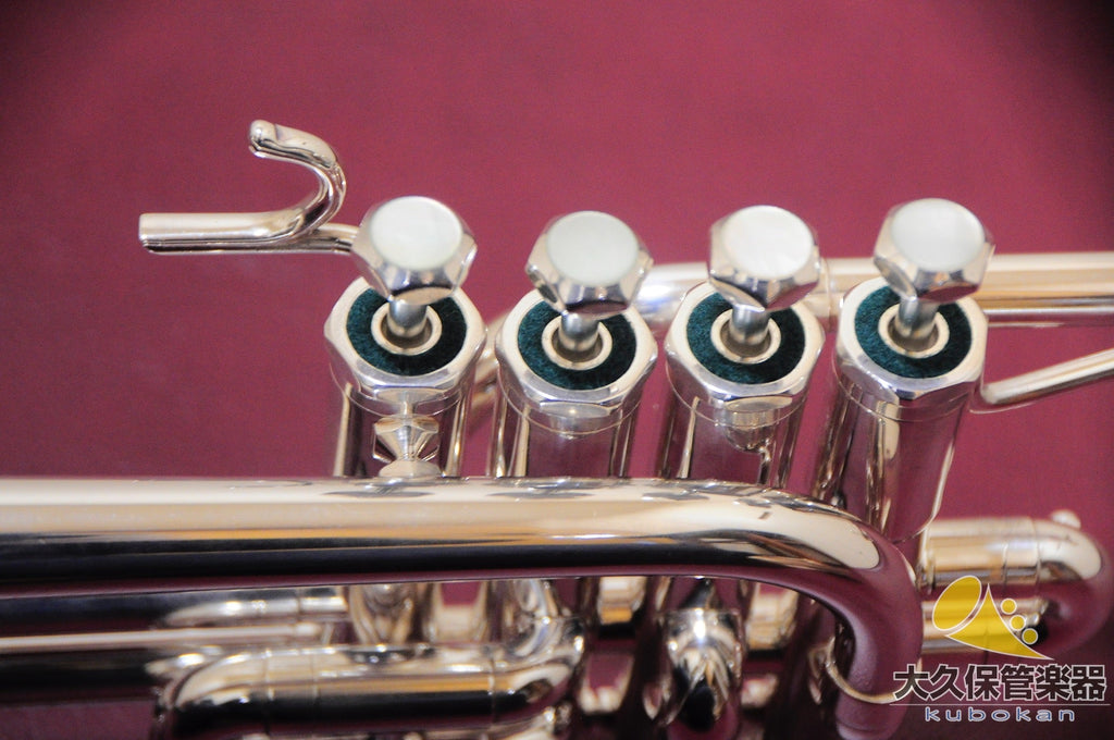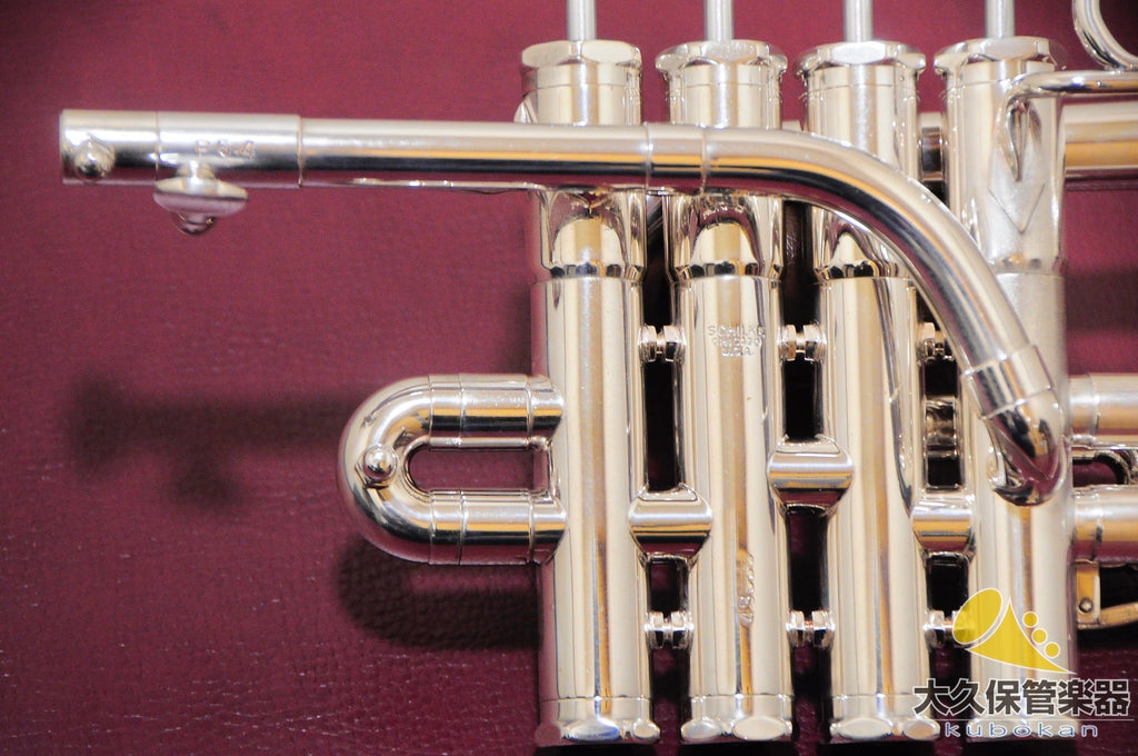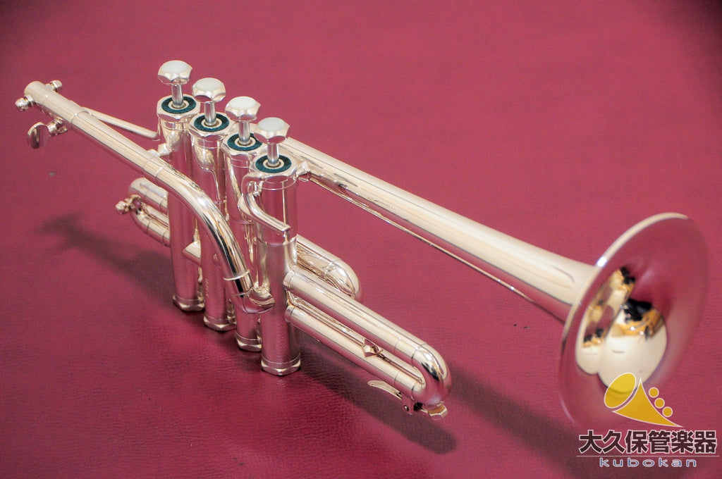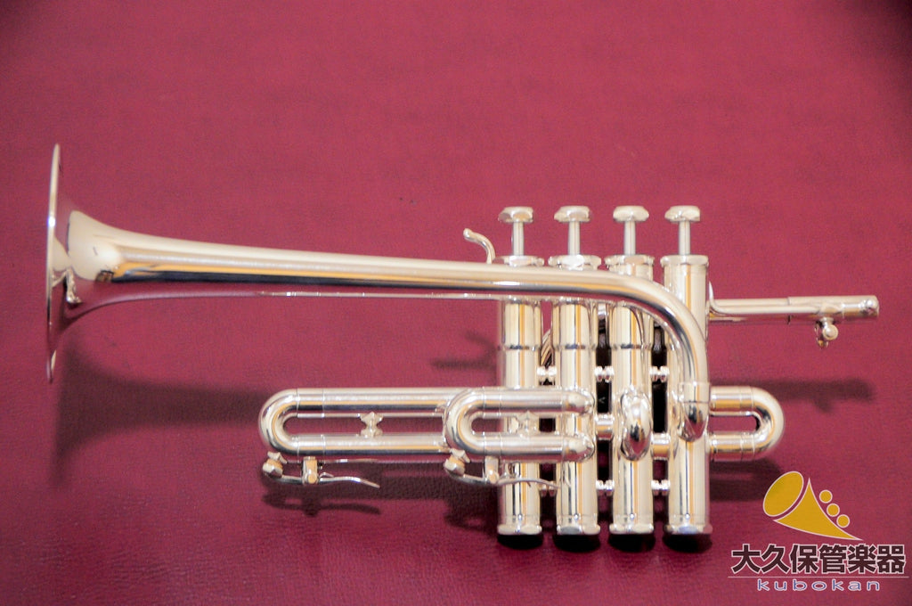 Silky Piccolo Trompette modèle P5-4. Cuivre de 4 pouces (101,6 mm). Perce de 450 pouces (11,42 mm). Finition argentée. Tube en B♭ et A avec embouchure de cornet (※). Poids de l'instrument : 915 grammes. Fabriqué en 1999.Accessoires : étui rigide d'origine. Prix neuf : 946 000 yens.