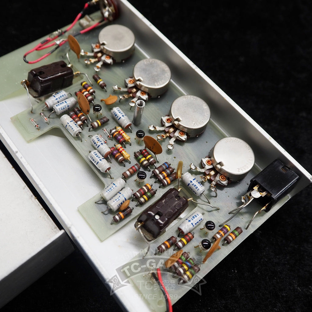 이펙터 브랜드로는 잘 알려지지 않은 Fender사에서 1968년부터 177년까지 제조된 강렬한 개성을 가진 퍼즈 페달입니다. 팟데이트 등으로 보아 1968년경에 제조된 초기 개체이지만, 여전히 파워감이 넘치는 제품입니다. 컨트롤은 VOLUME, SUSTAIN, TONE, BLEND(퍼즈 사운드의 분량 조절 가능)의 4가지로, 1960년대에 이미 듀얼 스위치 기술을 가지고 있어 ON/OFF 스위치와 TONE BOOST 스위치(볼륨을 높여 강렬한 트레블이 추가됨)를 장착하고 있는 것도 놀랍습니다. 장착되어 있는 것도 놀랍다. 한번 ON으로 설정하면 Fender의 이미지를 깨뜨릴 것 같은 묵직하고 흉폭한 옥타브 퍼즈 사운드가 튀어나온다. 복각판 등에서는 맛볼 수 없는 거칠고 생생하게 울부짖는 그 모습은 압권이다. 제조 기간이 비교적 길어 사용 부품이 다른 개체가 많이 존재하는 것도 이 모델의 특징 중 하나라고 할 수 있다. 외형도 견고하고 사운드도 뛰어난 개체입니다.