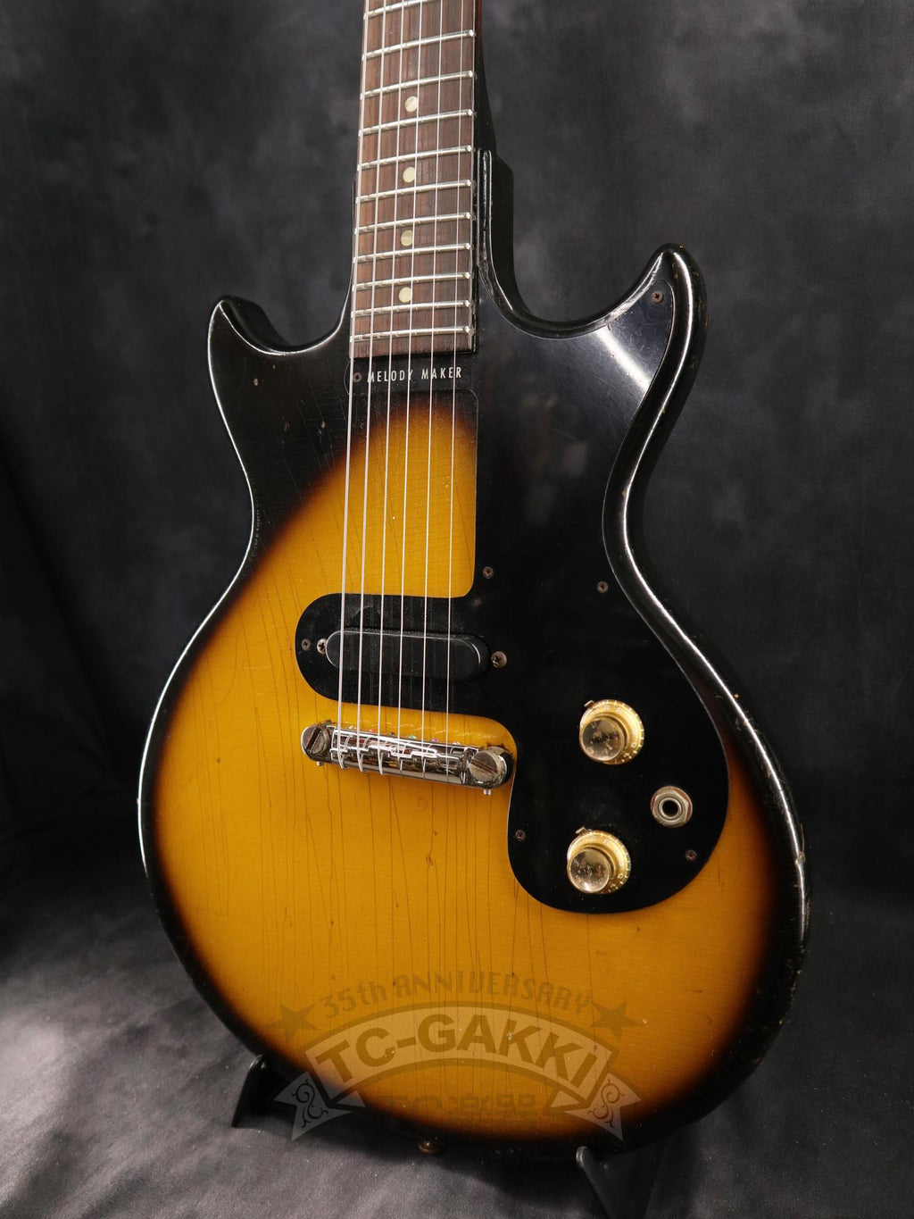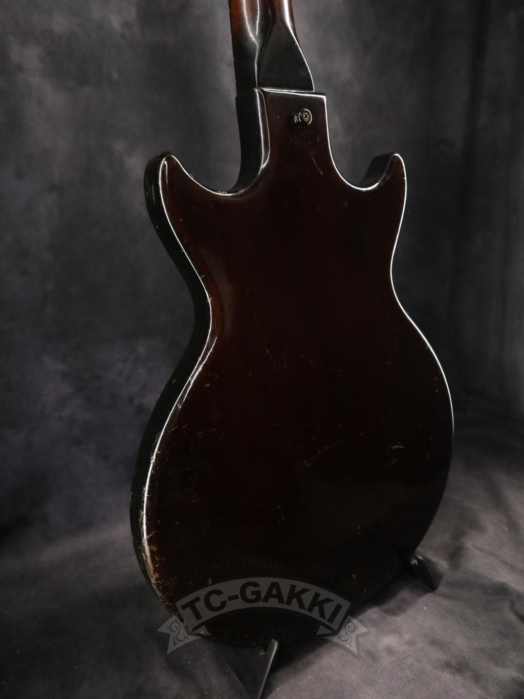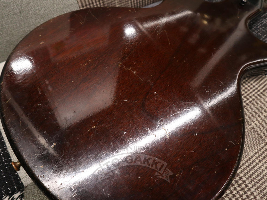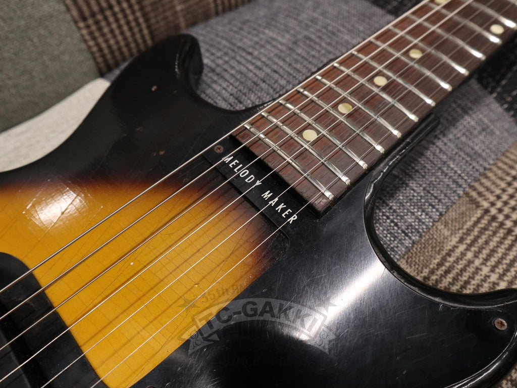 【SPEC.】 바디: 마호가니 더블 컷어웨이 넥: 마호가니 22프렛 (16프렛 조인트) 핑거보드: 브라질 로즈우드 픽업: 멜로디 메이커 싱글 코일 x1 너트 너비: 43mm 스케일: 24.75” 무게: 2.74kg 소프트 케이스 포함 ※프렛, 너트, 페그 교체됨 ※넥 조인트 부분에 목재 결손 있음