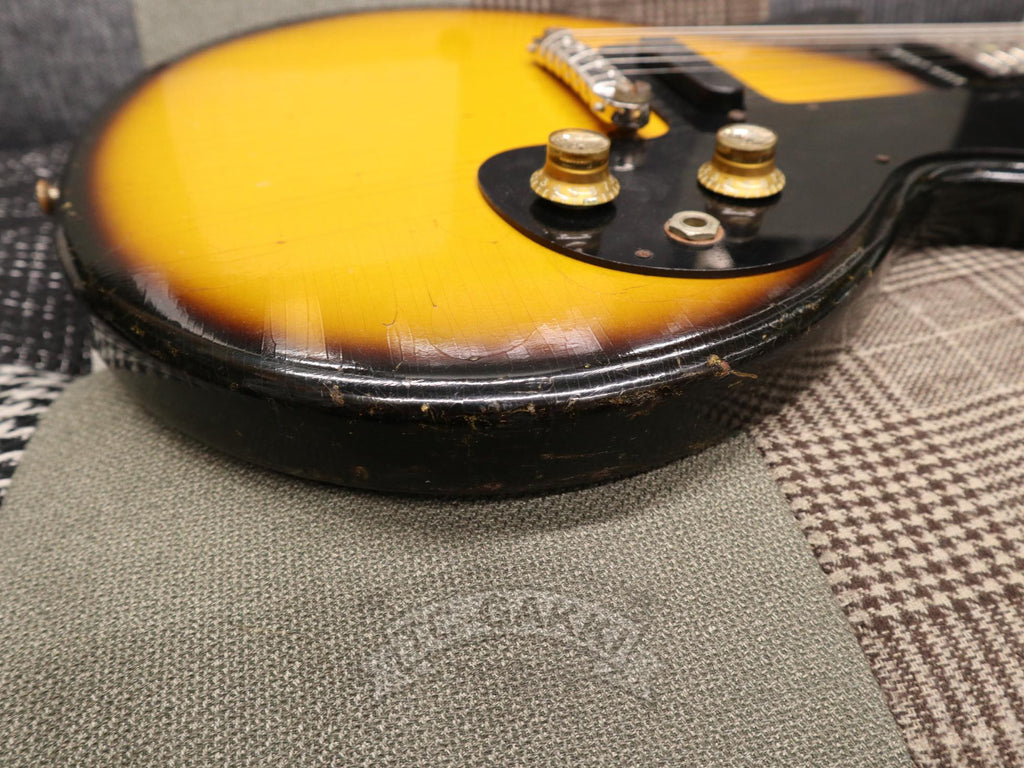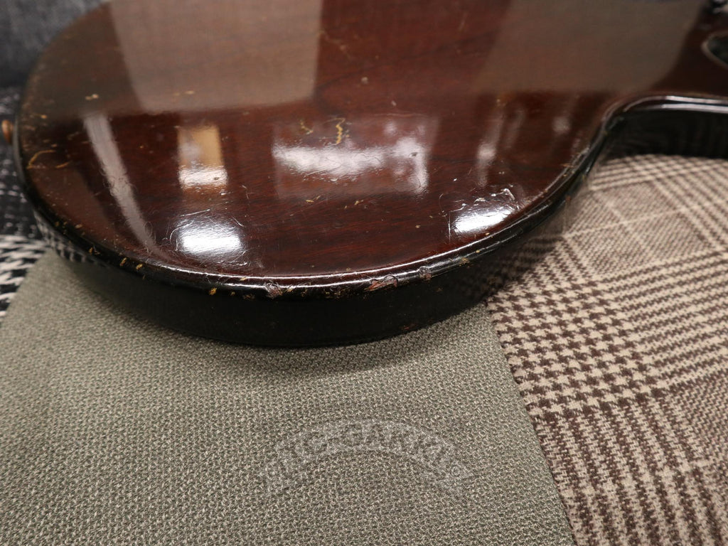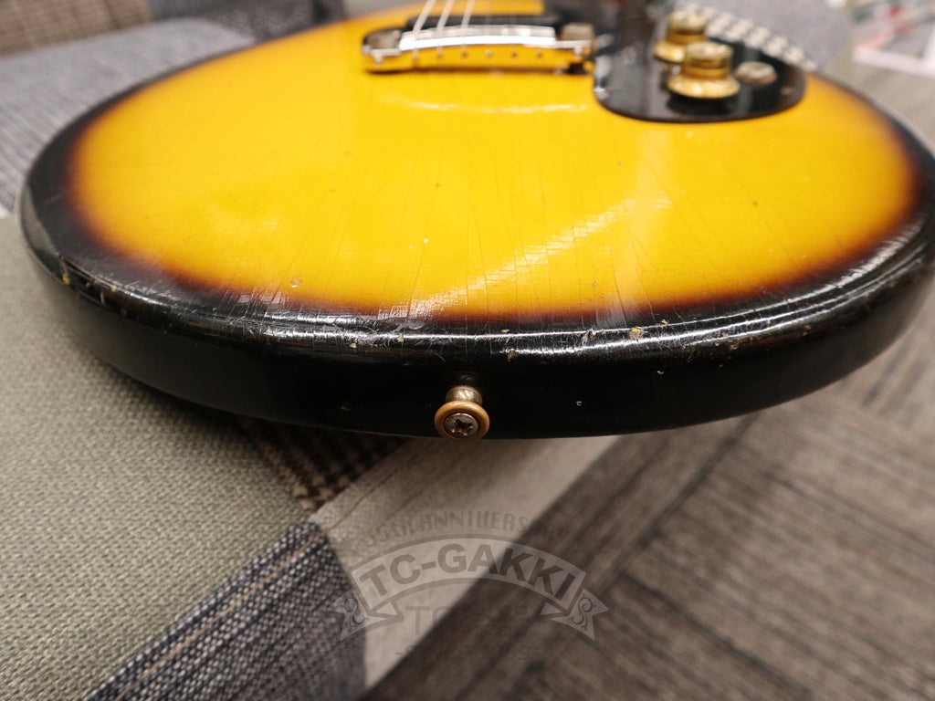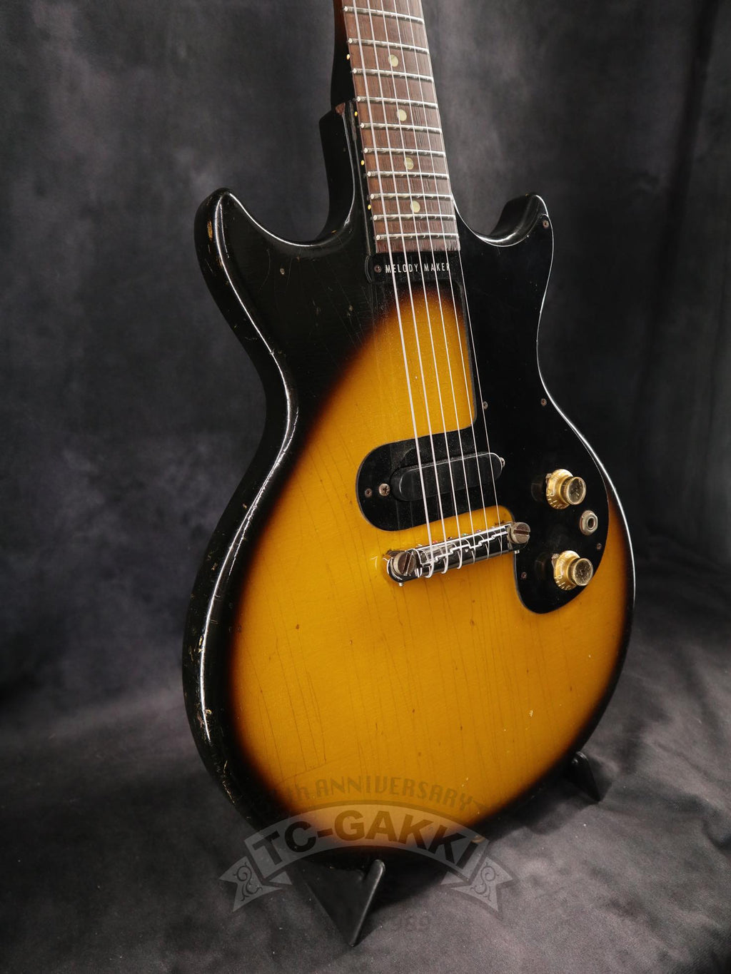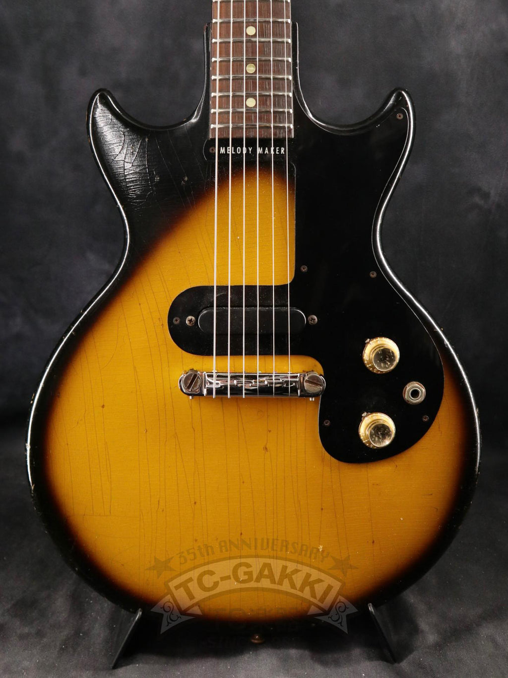 【SPEC.】 바디: 마호가니 더블 컷어웨이 넥: 마호가니 22프렛 (16프렛 조인트) 핑거보드: 브라질 로즈우드 픽업: 멜로디 메이커 싱글 코일 x1 너트 너비: 43mm 스케일: 24.75” 무게: 2.74kg 소프트 케이스 포함 ※프렛, 너트, 페그 교체됨 ※넥 조인트 부분에 목재 결손 있음