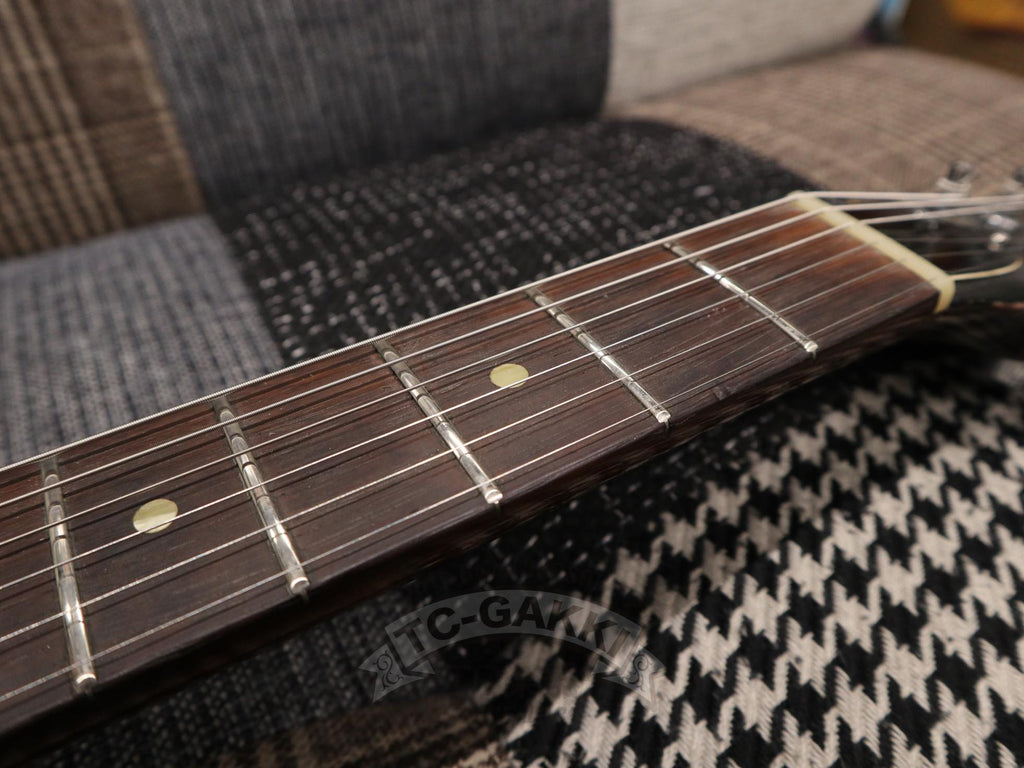 그리고 이 개체의 매력은 프렛과 너트가 교체되어 있다는 점입니다. 빈티지 특유의 탄탄한 그립감을 자랑하는 넥과 어우러져, 손에 든 순간 무심코 “뭐야, 연주하기 참 편하네”라는 말이 절로 나올 정도의 뛰어난 연주성을 실현했습니다. 단순히 장식용이 아닌, 현장에서 마음껏 활용할 수 있는 실용적인 기타로 완성되었습니다.