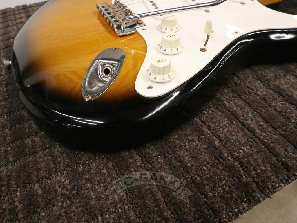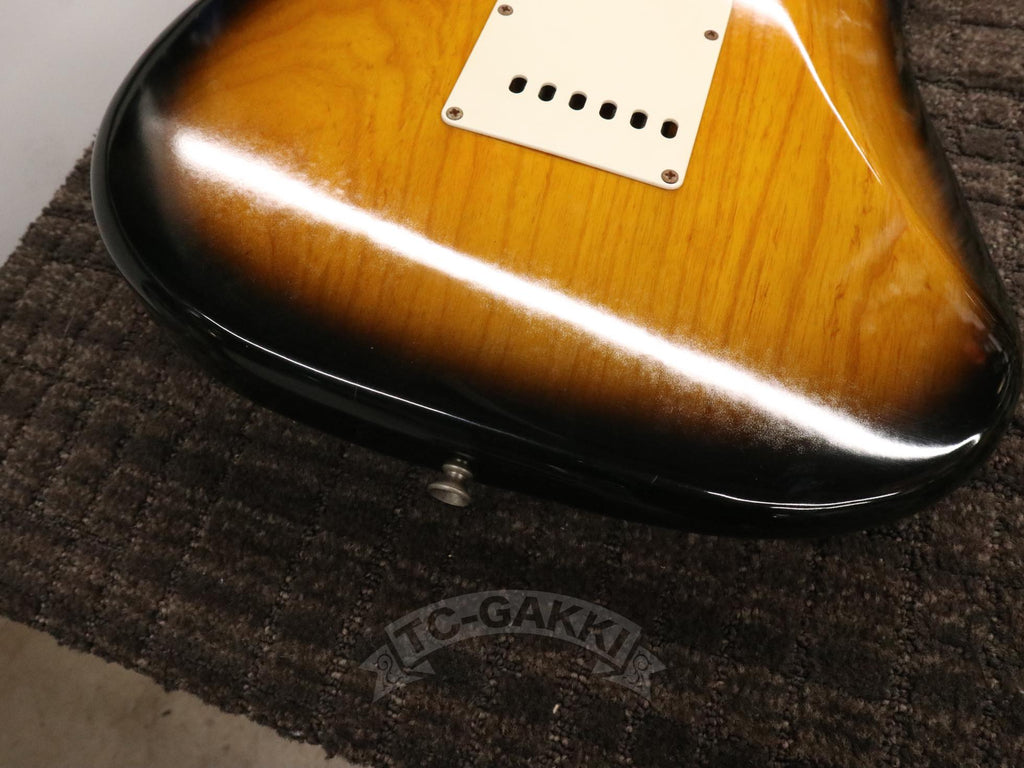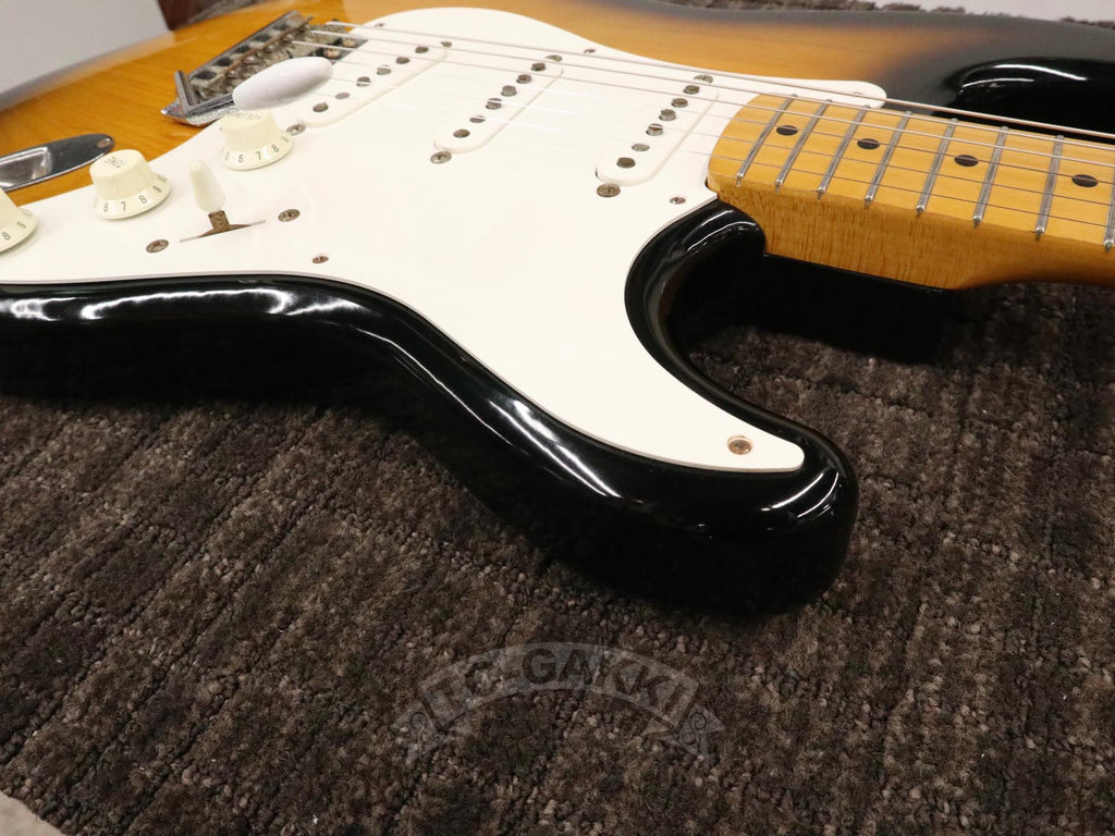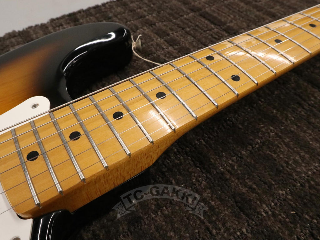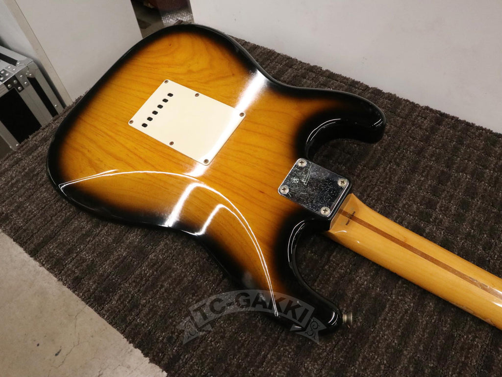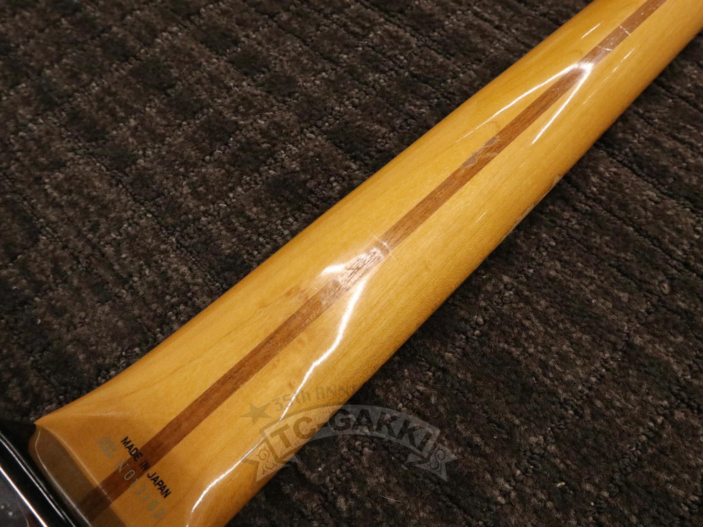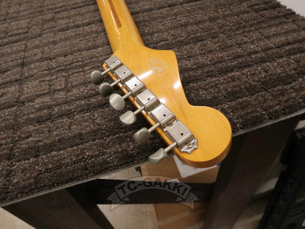 1993-1994년제 Fender Japan ST54-75RV 커스텀 에디션 상급 모델. 1982년, 본사로부터도 높은 평가를 받으며 출범한 펜더 재팬. 그 설립을 뒷받침한 것은 그레코의 슈퍼 리얼 시리즈를 담당했던 후지현악기제조, 현재의 후지겐 정예 팀이었습니다. 저비용이면서도 본사에 버금가는 완성도는 당시 세계 시장마저 놀라게 했습니다. 본 기기는 스트라토캐스터의 원점인 54년 사양을 철저히 재현했습니다. 두꺼운 하드 V 셰이프 메이플 넥은 좋은 의미로 일본제답지 않은 당당한 그립감을 지녀 플레이어에게 확실한 손맛을 선사합니다. 더불어 라이트웨이트 애쉬 특유의 나뭇결은 어딘가 이국적인 표정을 엿보게 하여 시각적으로도 소유욕을 충족시켜 줍니다.