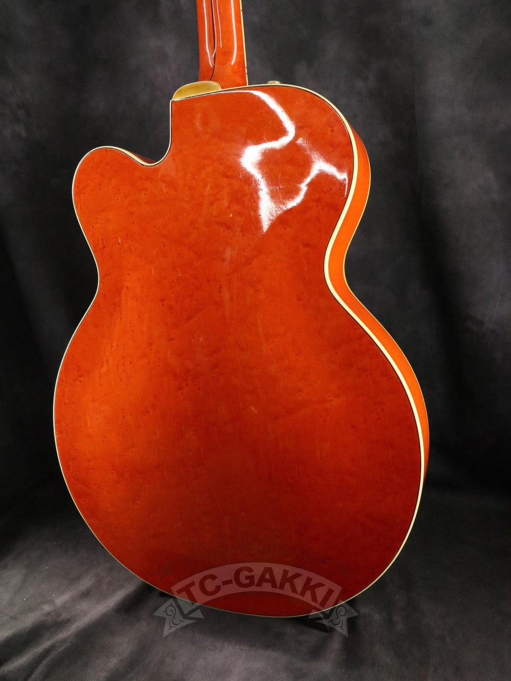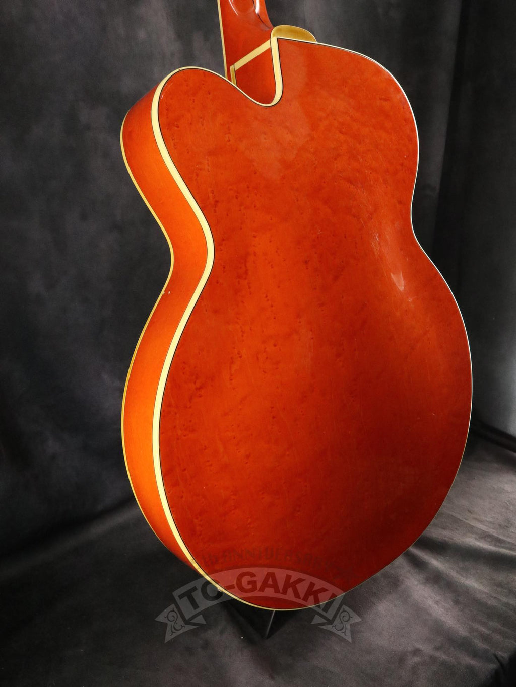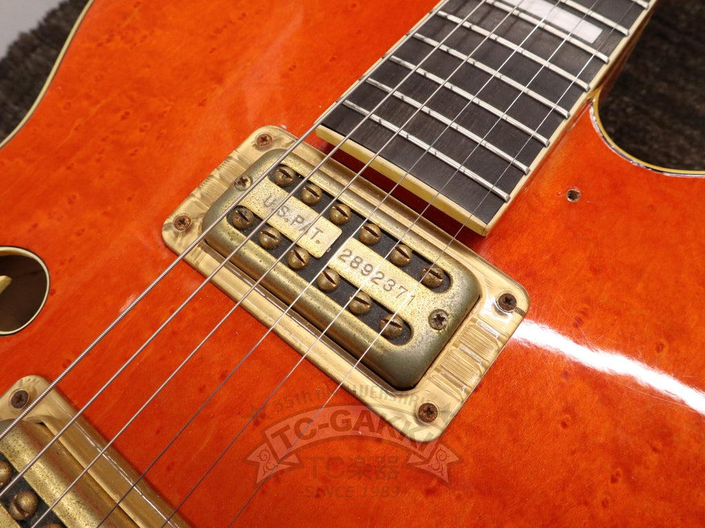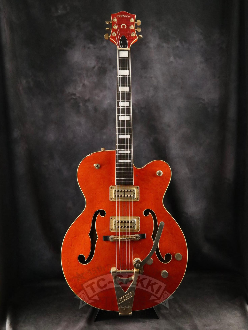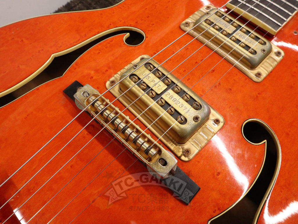 1993년제 GRETSCH 6120 Nashville. 1954년 탄생한 6120의 계보를 잇는 내슈빌 시리즈의 기본형. 헤드에 새겨진 상징적인 말발굽 호스슈 마크와 존재감 있는 블록 포지션 마크가 이 모델의 정체성을 유감없이 보여줍니다.16인치 완전 중공 바디 아치탑 구조에 레이 버츠가 개발한 필터트론을 탑재했습니다. 그 사운드는 섬세함을 갖추면서도 결코 가늘어지지 않는 고음역과, 따뜻함을 지니면서도 윤곽을 잃지 않는 중저음이 절묘하게 공존합니다. 더불어, 음의 흔들림이 풍부하게 퍼지는 다이내믹한 비브라토 연주법 또한 이 모델만의 큰 매력입니다.바로 그레치 사운드라 부를 만한 울림이라 할 수 있습니다.