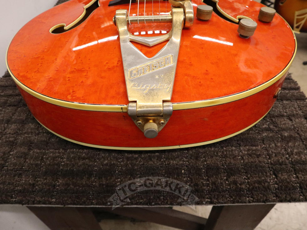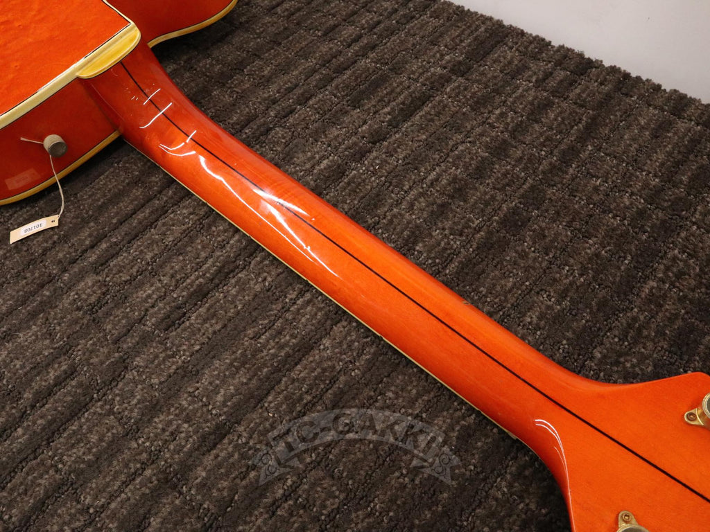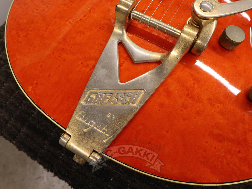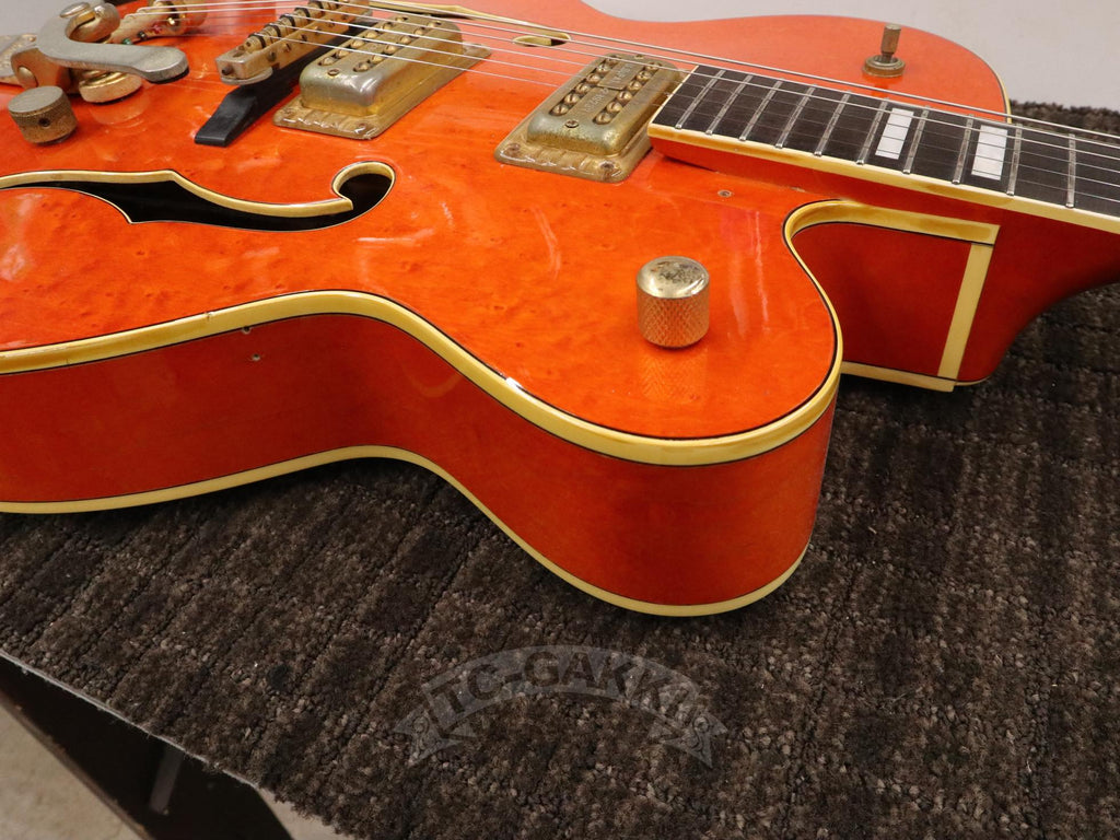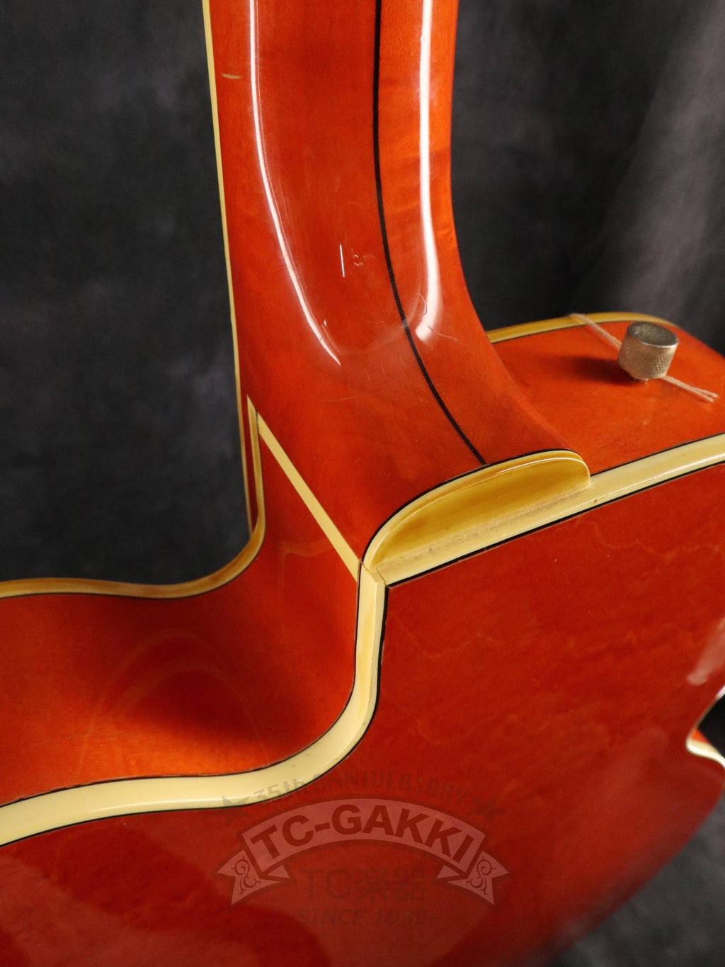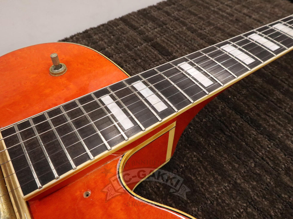 1993년제 GRETSCH 6120 Nashville. 1954년 탄생한 6120의 계보를 잇는 내슈빌 시리즈의 기본형. 헤드에 새겨진 상징적인 말발굽 호스슈 마크와 존재감 있는 블록 포지션 마크가 이 모델의 정체성을 유감없이 보여줍니다.16인치 완전 중공 바디 아치탑 구조에 레이 버츠가 개발한 필터트론을 탑재했습니다. 그 사운드는 섬세함을 갖추면서도 결코 가늘어지지 않는 고음역과, 따뜻함을 지니면서도 윤곽을 잃지 않는 중저음이 절묘하게 공존합니다. 더불어, 음의 흔들림이 풍부하게 퍼지는 다이내믹한 비브라토 연주법 또한 이 모델만의 큰 매력입니다.바로 그레치 사운드라 부를 만한 울림이라 할 수 있습니다.