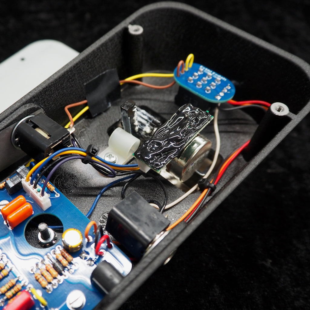 여기서부터는 조금 매니악한 이야기입니다. 관심 있으신 분만 들어주세요. 자, 빠르게 설명하겠습니다(웃음). 와우에는 인덕터를 사용한 고전적인 와우 회로 외에도 오퍼앰프를 사용한 타입도 존재하며, 제품으로서의 안정성(개체 차이)이나 비용 면에서는 압도적으로 오퍼앰프 방식이 우수하다고 할 수 있습니다. 개발 초기에는 MELLOW WAH에서 디스토션이 적은 사운드를 목표로 했기 때문에 오퍼앰프 방식을 검토했지만, 최종적으로는 인덕터를 사용한 회로를 채택했습니다.모호한 표현이 되겠지만, 소리의 번짐이나 밟았을 때의 변화가 인덕터 방식이 더 음악적으로 느껴졌습니다. 아웃 버퍼를 채택한 이유는 두 가지입니다. "다음에 연결할 장비와의 매칭을 용이하게 하기 위함"과 "위상을 반전시키지 않기 위함"입니다. 이는 실제 와우 사용 시 도입이 압도적으로 쉬워집니다.