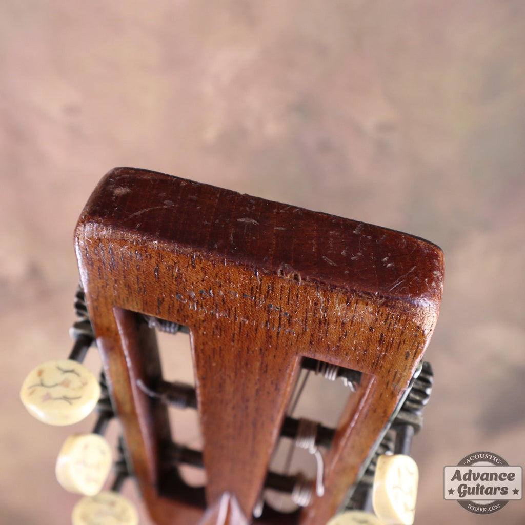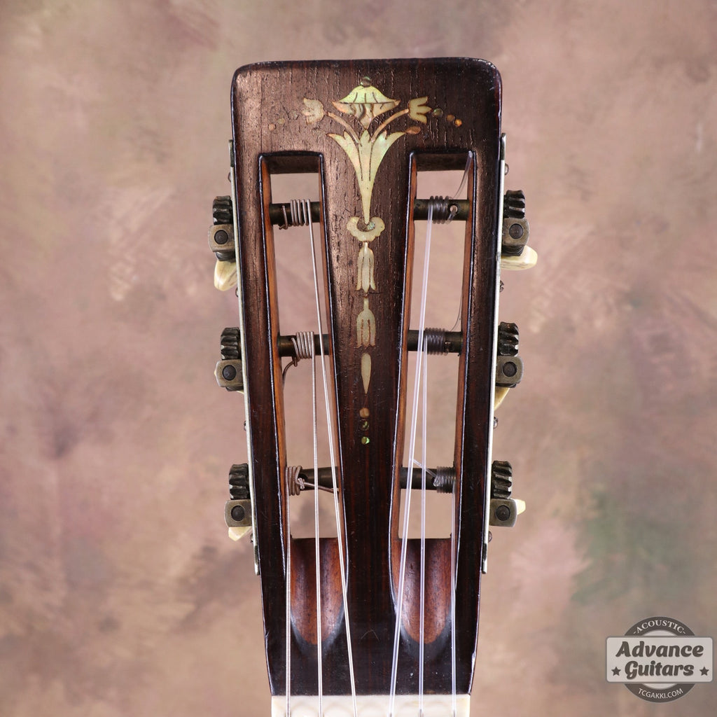 細かな彫刻に加え、ペグ・ボタンにも花のインレイが加えられています。