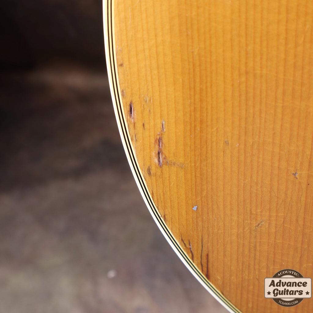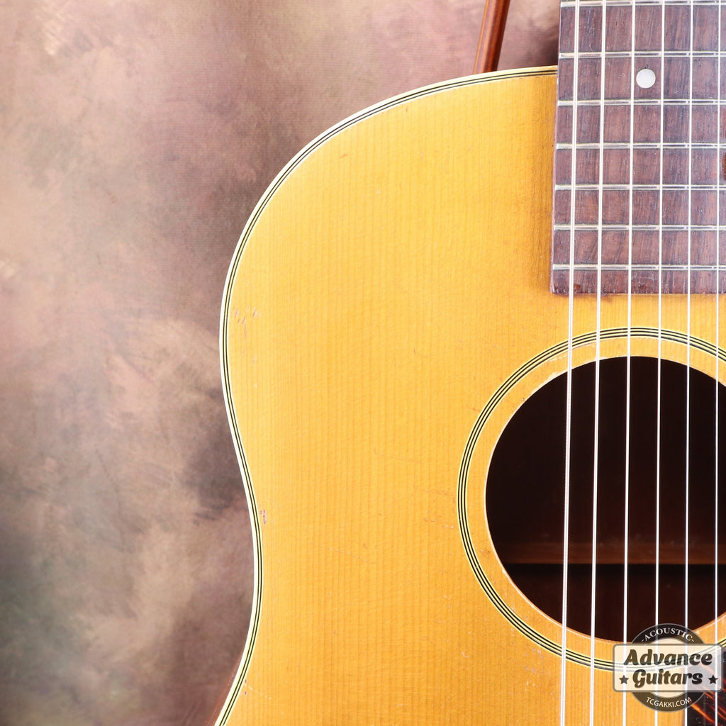 トップ材にはスプルースを仕様し、ロゼッタは7層のマルチカラーを採しています。 また、サウンドホールが指板エンドよりもやや下側に位置しています。 ボディカラーは1939年ごろより登場するナチュラルカラーでフィニッシュされています。