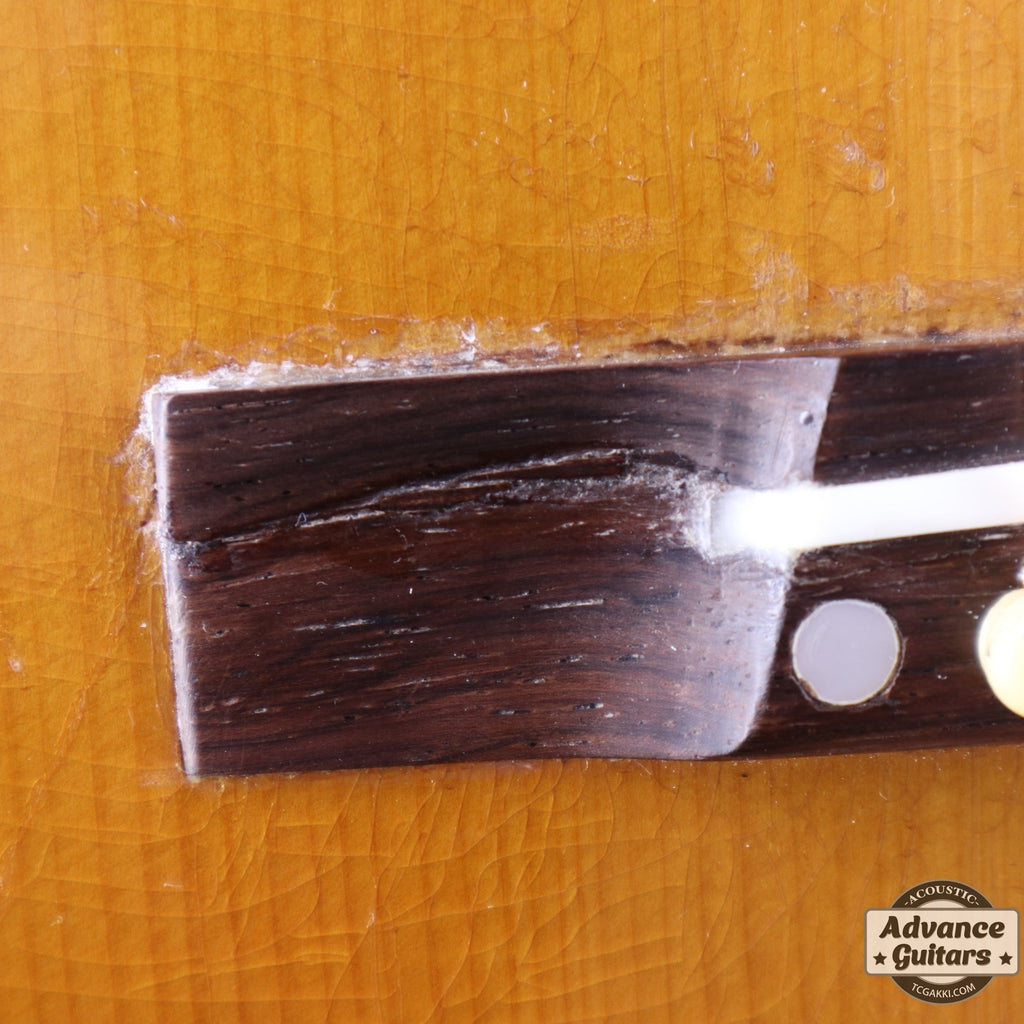 レクタンギュラーブリッジはローズウッド材が採用され、ロングサドルがセットされています。 長年の使用により横割れの補修がされていますが、大切に補修しながら使用されてきたことが伺えます。