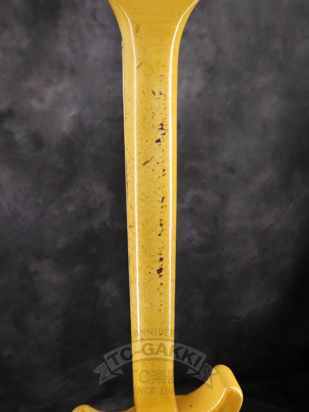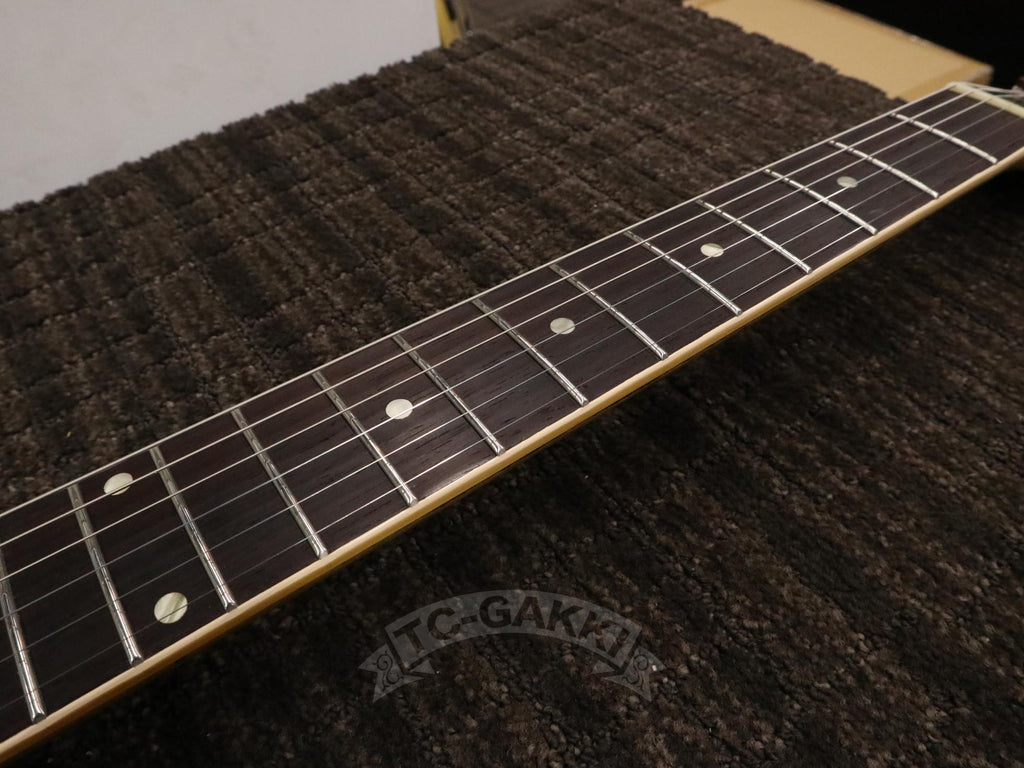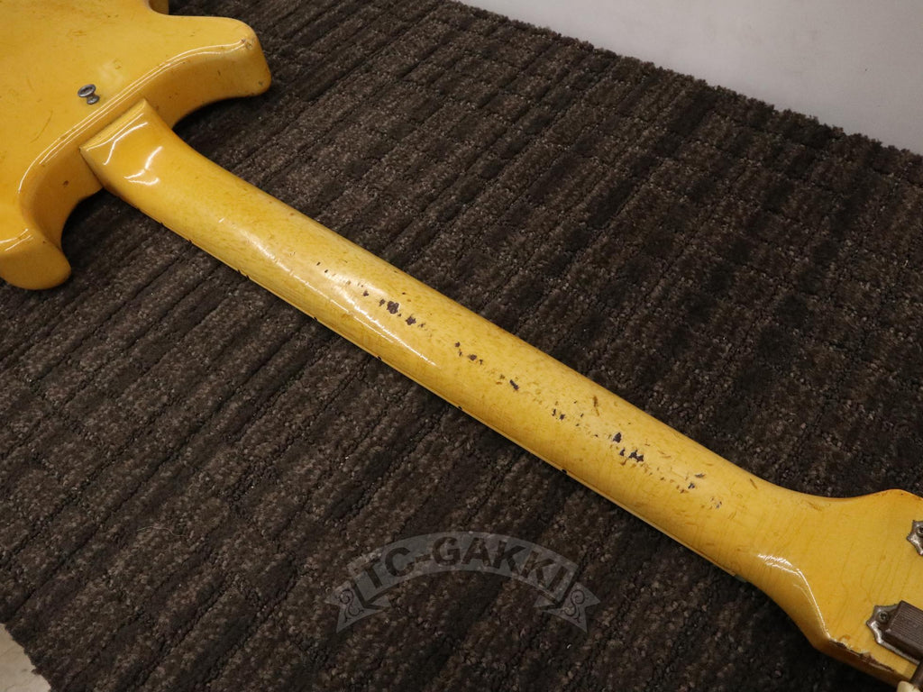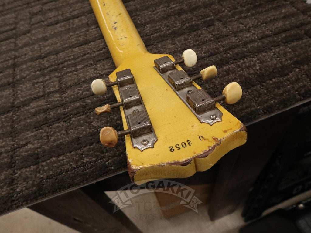 搭載されるP-90は、コイルターン数が多く巻かれたシングルピックアップ。シングル特有のざらつきのある高音域と、押し出しの強い中音域をバランス良く併せ持ち、コードでも単音でも音が前に出る感覚を味わえます。ネックは薄めで握りやすく、ハイポジションまでの演奏性能も非常に優秀。薄めでテーパーがあまり効いていない独特のフィーリングも、この年代ならではの魅力です。アルミのバーブリッジ、バンブルビーキャパシター、ヴィンテージの3連ペグなど、現在復刻で見ることのできる仕様のオリジナルを随所に体感できるのもポイント。ペグにはシュリンクしている箇所もございますが、安心して使用できる付属パーツも付属します。そして何より、この個体が鳴らす倍音の多い、色気のあるシングルコイルサウンド。弾き始めると時間を忘れて没頭してしまう、ヴィンテージでしか味わえない音がここにあります。
