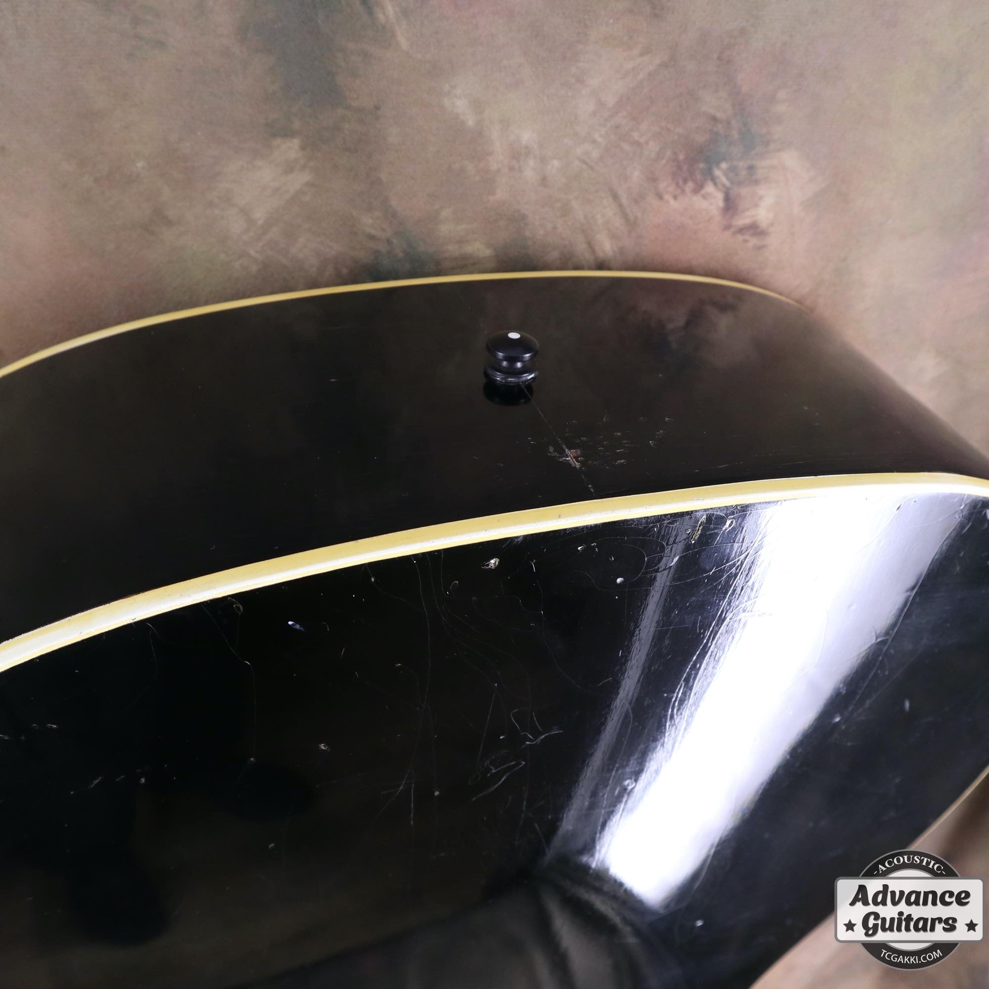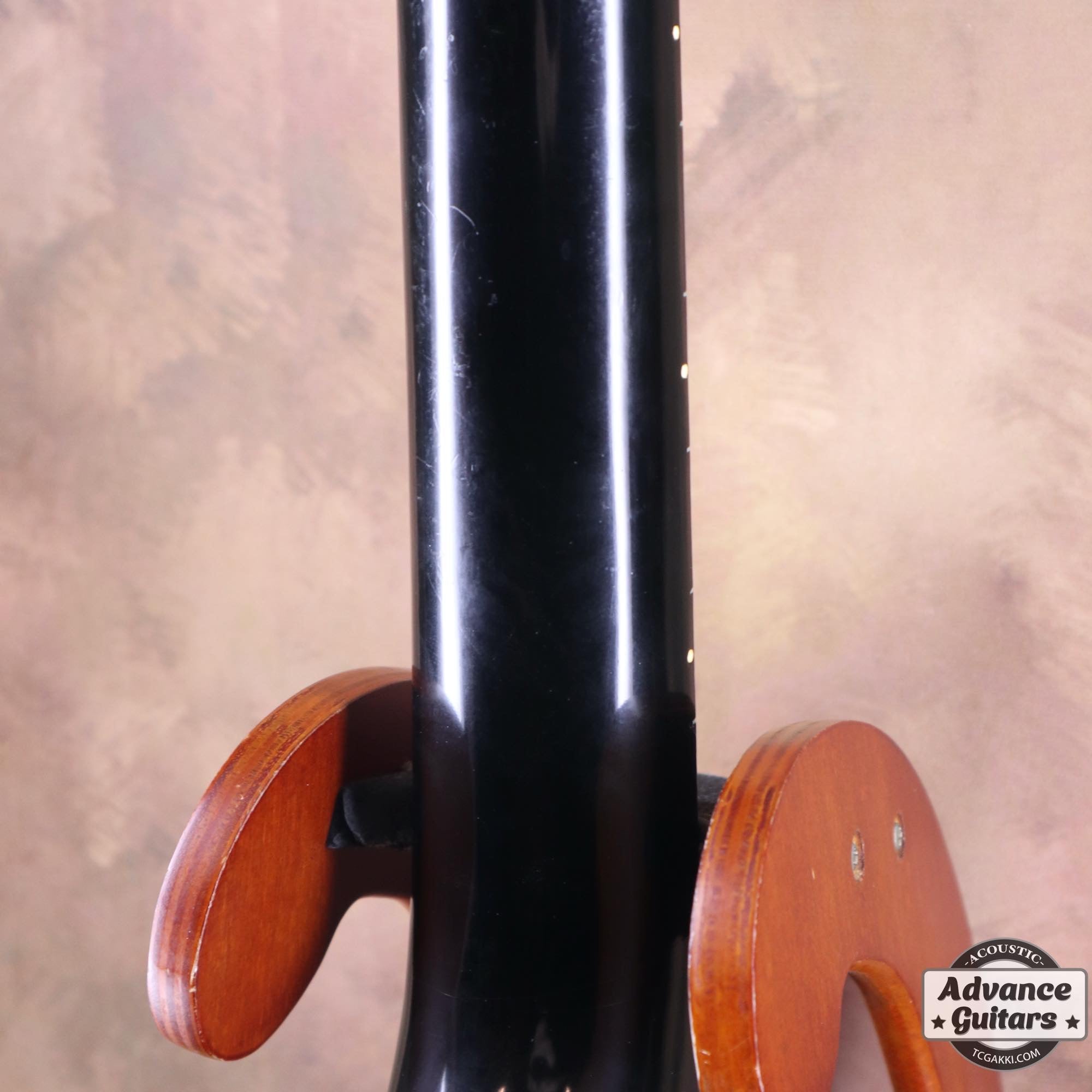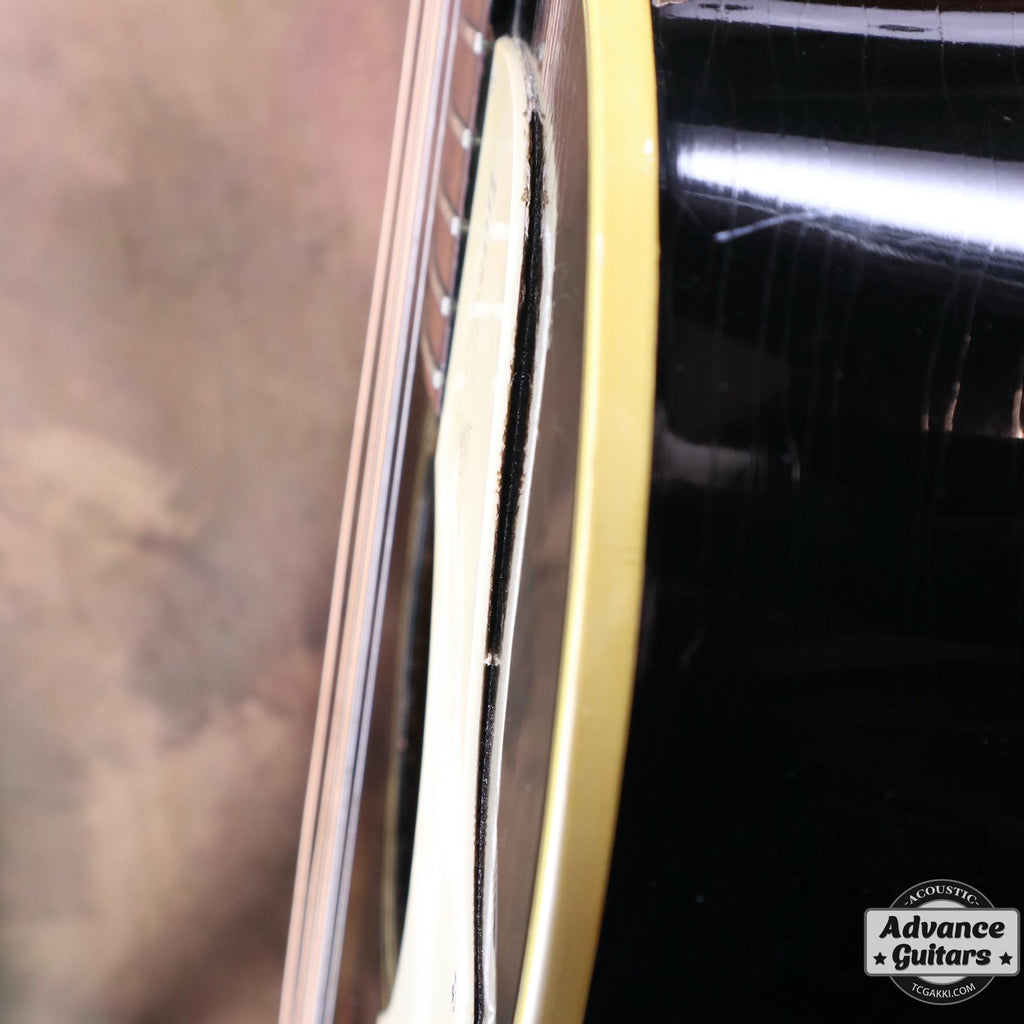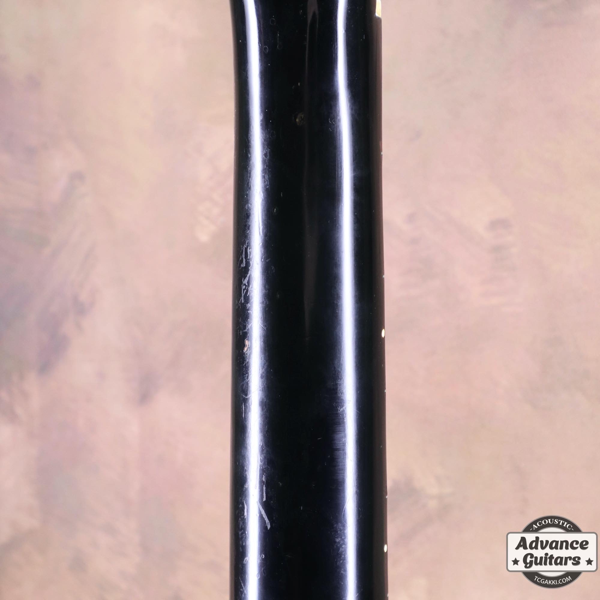 -ボディトップのダメージ部分にいくつかのタッチアップ、ネックのオーバーラッカー等はありますがクラックやクラックリペアはなく、チェッキング、バインディングの色やけが渋い貫禄のあるエボニーブラックです。