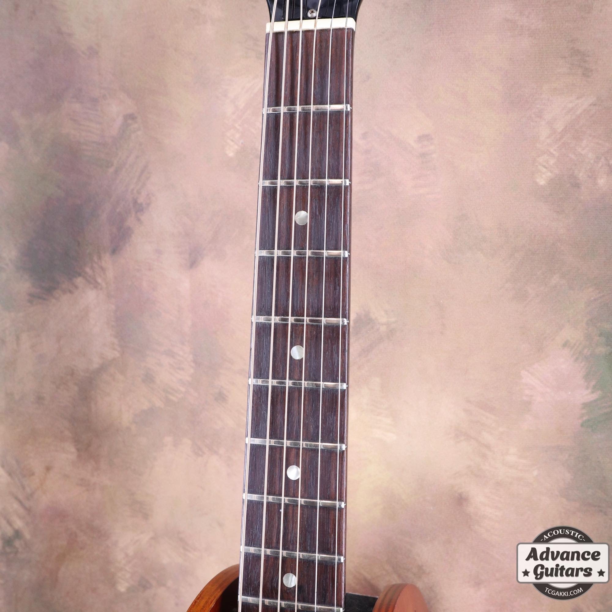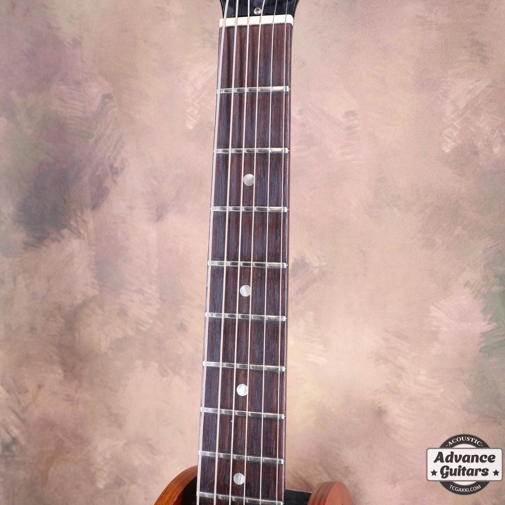 ローズウッドサドルが搭載されたダウンベリーブリッジにナローネックという組み合わせ、シャキシャキと鳴るイメージの仕様ですが、こちらの個体は芳醇な音色で、高音も粒立ち良く、枯れたニュアンスで響いてくれるので、爪弾いてメローなサウンドを奏でても良いです。