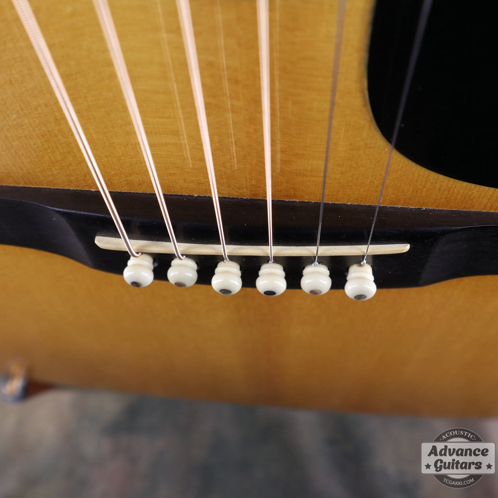 ーブリッジ エボニーのダウンベリー・ブリッジにはホワイトのブリッジピン(アバロン・ドット)とショートサドルがセットされています。 1980年頃よりサドルの素材が象牙からミカルタへ仕様変更されるのが80年代のD-45の特徴です。
