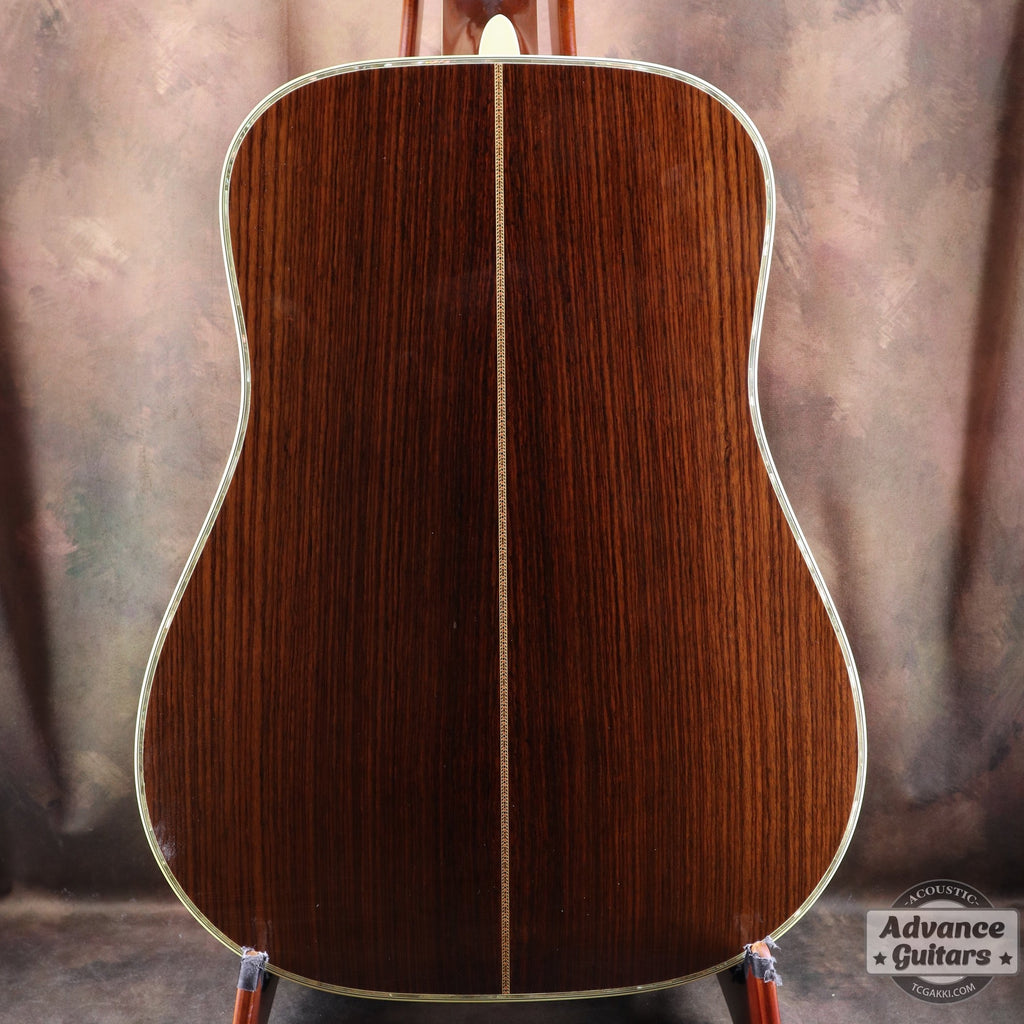 柾目取りのインディアン・ローズウッドを使用したサイド/バックにはホワイトのセルとアバロンシェルの装飾が施されています。
