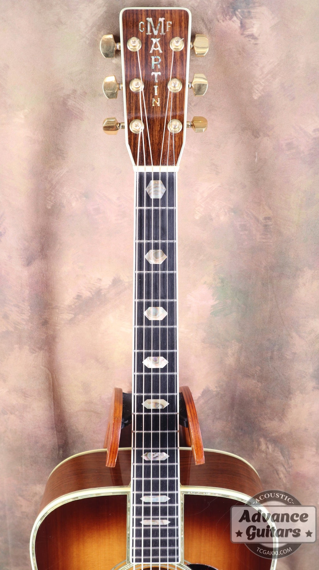 ローズウッドを突板にした角張ったヘッドにはアバロン・シェルを使用したバーティカル・ロゴ(通称:縦ロゴ)が採用されています。