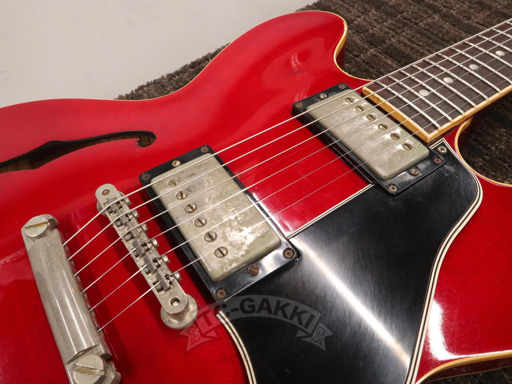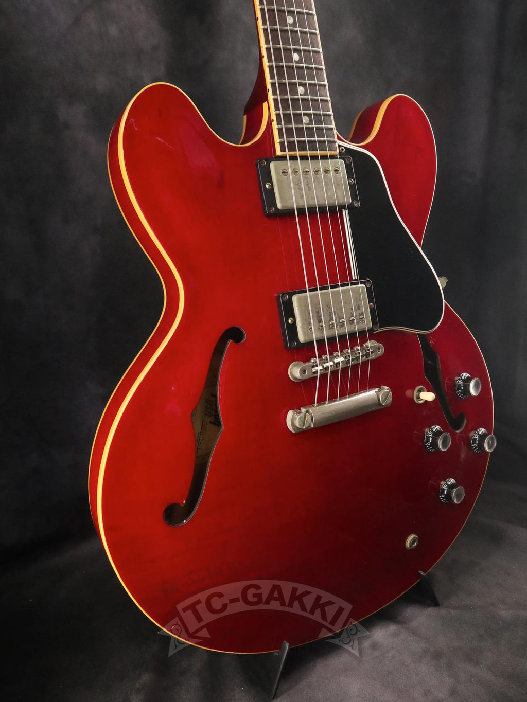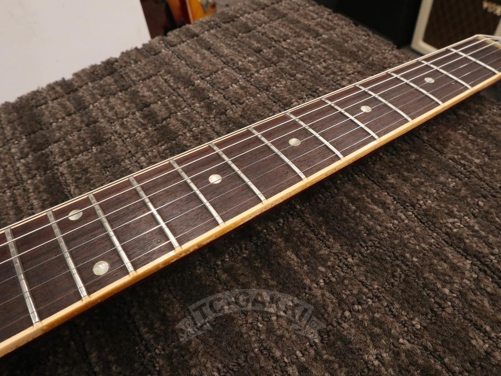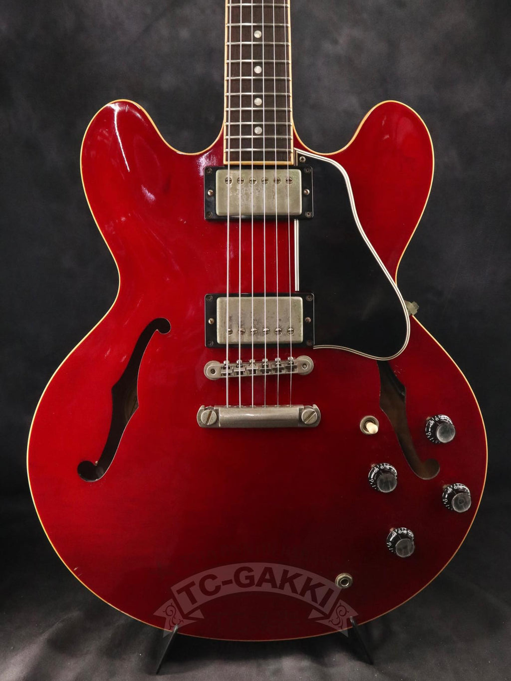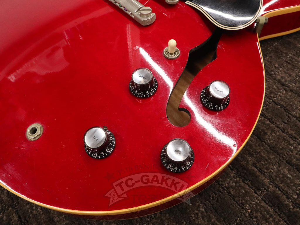 Gibson ES-335は、その魅力を非常に素直に体感できる個体です。搭載されている57クラシックは、出力を過度に主張することなく、それでいて不足を感じさせないパワー感を持ち、ピッキングの強弱やタッチの違いをそのまま音に反映してくれます。薄めの60年代スタイルネックは演奏性が高く、長時間弾いても余計なストレスを感じにくい設計です。