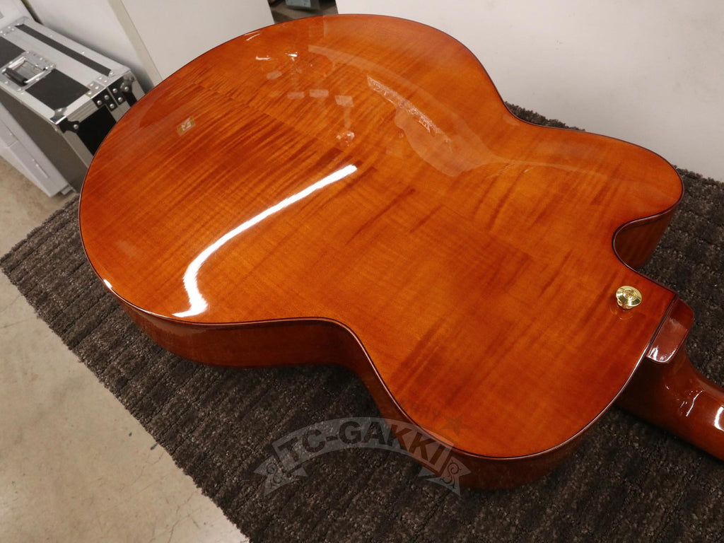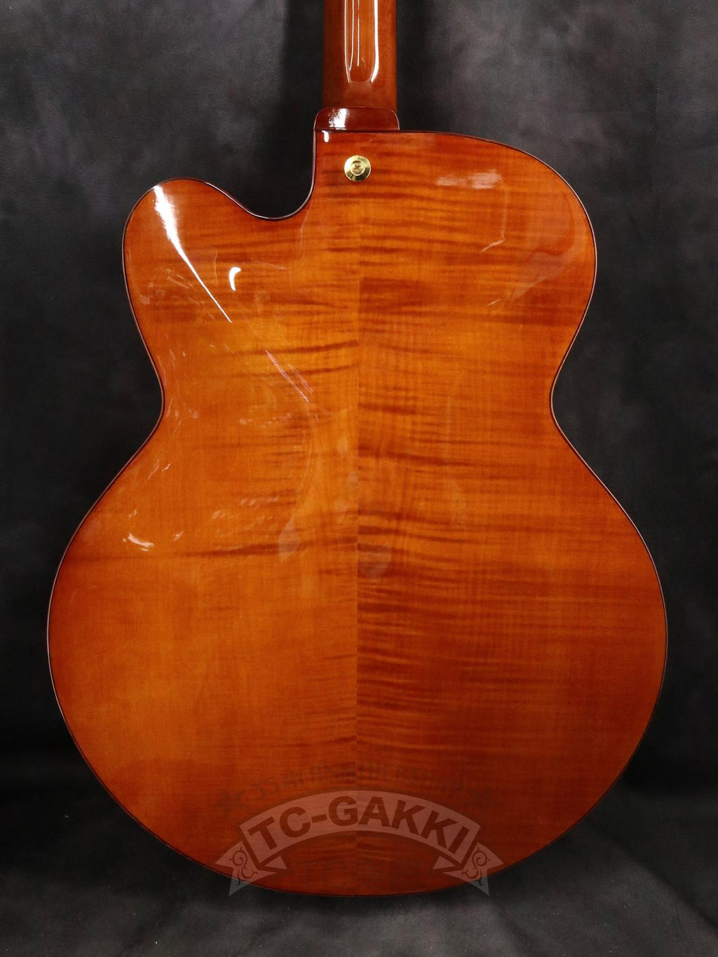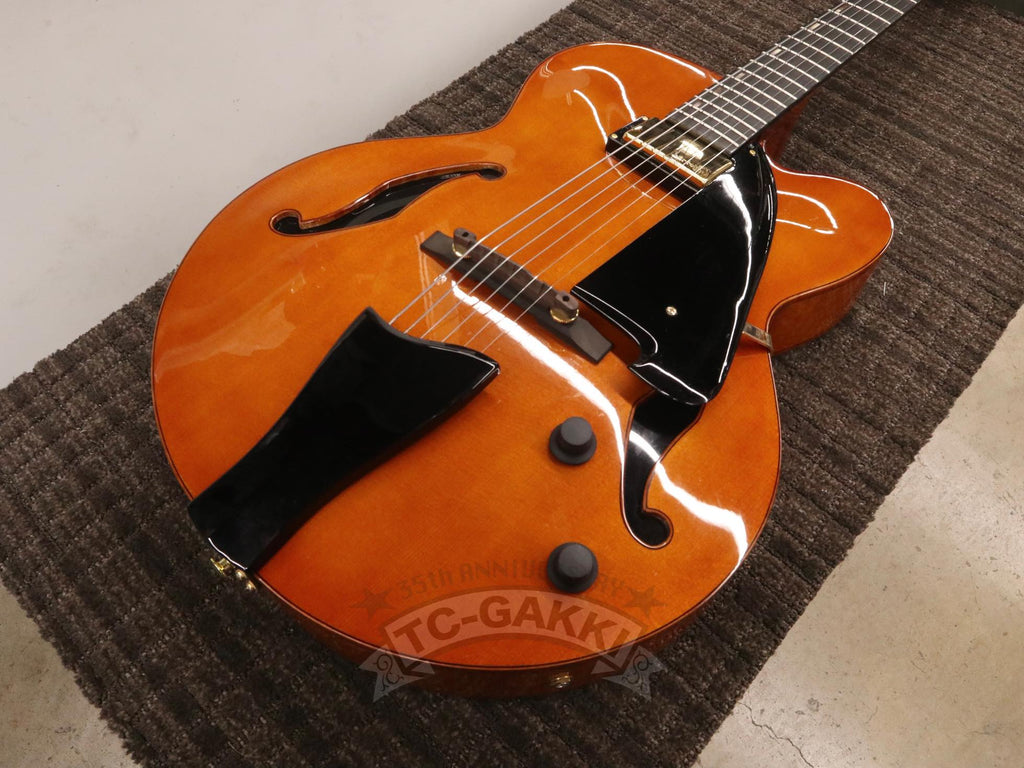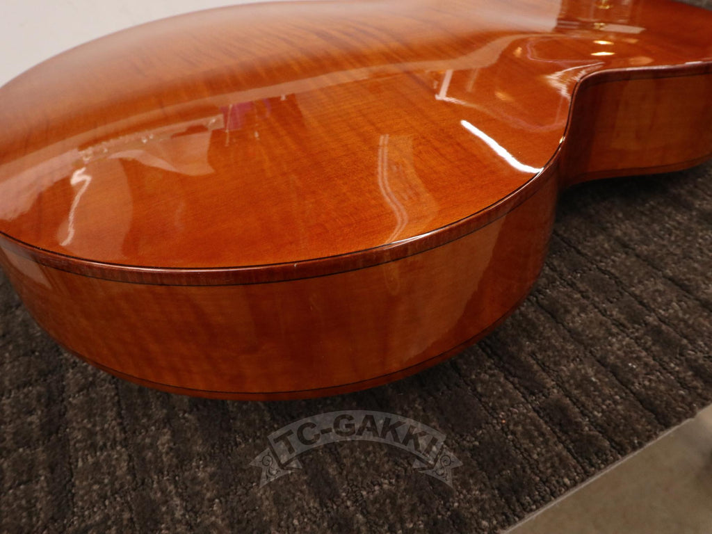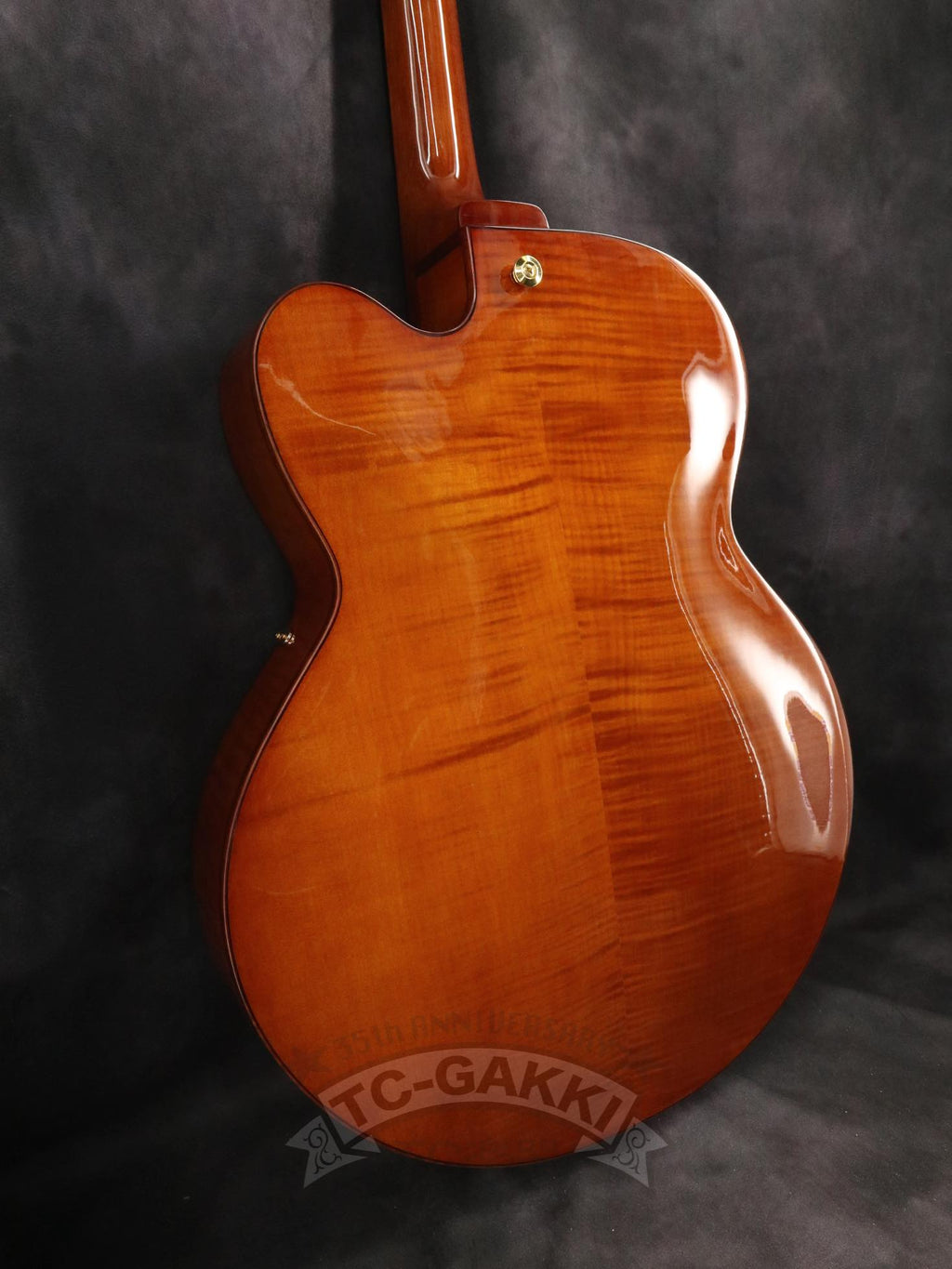 このモデルが採用している16インチの小ぶりなボディは、日本人の体格にも無理なくフィットするサイズ感です。ボディ内部は完全な空洞構造のフルアコースティック仕様で、弾いた瞬間に空気が震えるような自然な箱鳴りを感じられます。指板には硬質なエボニーを用いることで、音の立ち上がりが明瞭になり、ジャズらしい粒立ちの良いアタックを生み出します。