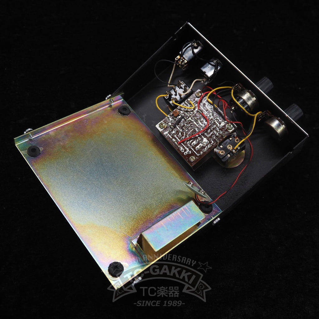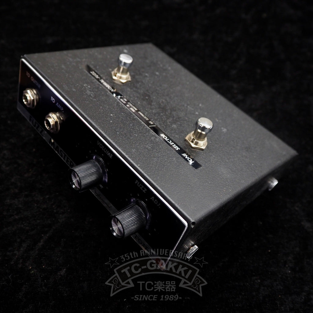 コントロール系は、電源スイッチを兼ねる"VOLUME"と歪みを調節する"FUZZ ADJ."とトーンセレクターフットスイッチ、バイパスフットスイッチです。"FUZZ ADJ."をミニマムにしても結構歪んでいて、上げていくと歪みが増すと同時に倍音が湧き上がっていきます。ビービー、ジージーという国産ファズらしい歪みに、憂いを含んだアッパーオクターブが加わって艶やかで深みのあるサウンドになります。コードを弾いた際は音が潰れ気味になりますが、その分かなり押し出しの強い豪快なサウンドで主張しまくります。トーンセレクターで切替可能のドンシャリサウンドは驚異的なメタリック感を演出します。サウンドも素晴らしい個体で、まさに国産ファズの名機と言える一品です!
