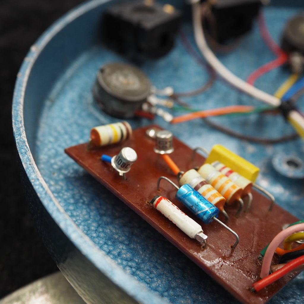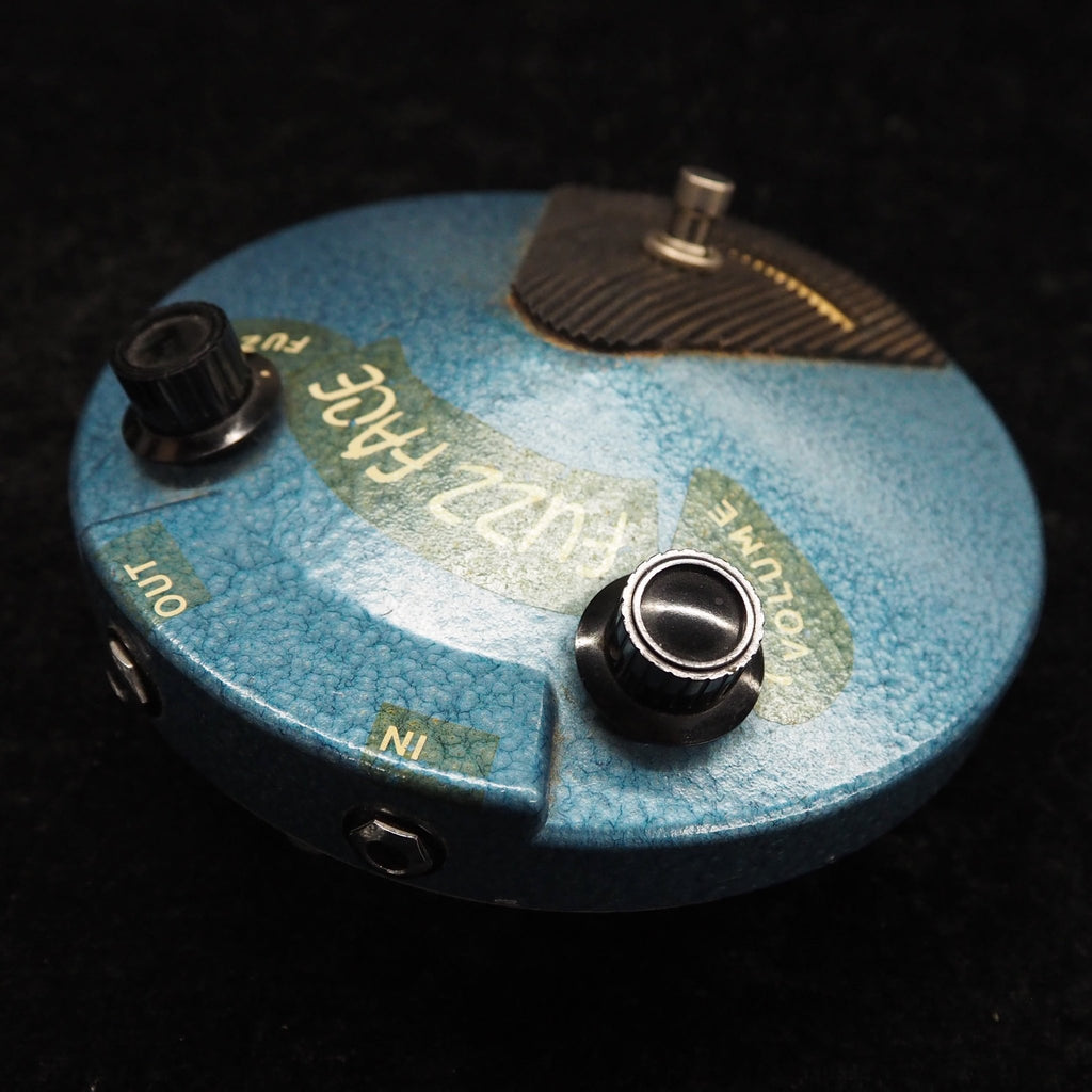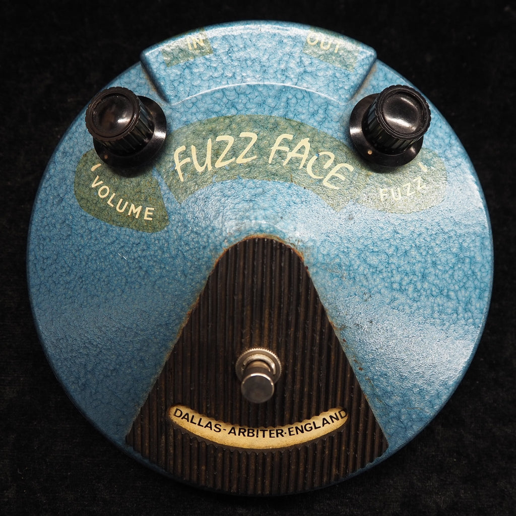 1966年後半に登場したファズフェイスは、当初PNPゲルマニウムトランジスタNKT275を採用しましたが、1960年代末にNPNシリコントランジスタBC108(他にBC109、BC183L等も確認されている)に仕様変更されています。また、筐体やカラーにもいくつかのバリエーションが見られます。1968年にはアービター社とレンジマスターで知られるダラスミュージック社との合併により、"DALLAS-ARBITER・ENGLAND"名義となります。さらに1975年にはCBSによって買収されています。本機は、"DALLAS-ARBITER・ENGLAND"名義の1960年代末〜1970年代初期の個体と推測されます。本品は残念ながら後年のTELEFUNKEN BC108Cへ交換されています。シリコントランジスタBC108はNKT275仕様に比べてゲインに余裕を持ち、FUZZコントロールを徐々に上げると、それはそれは太く迫力のあるサウンドを持っています。本品はトランジスタの交換がありますが、それらしいオリジナルと遜色のない素晴らしいサウンドを持った個体です。