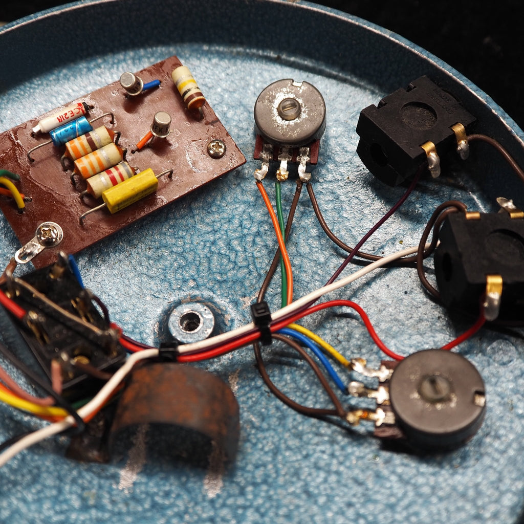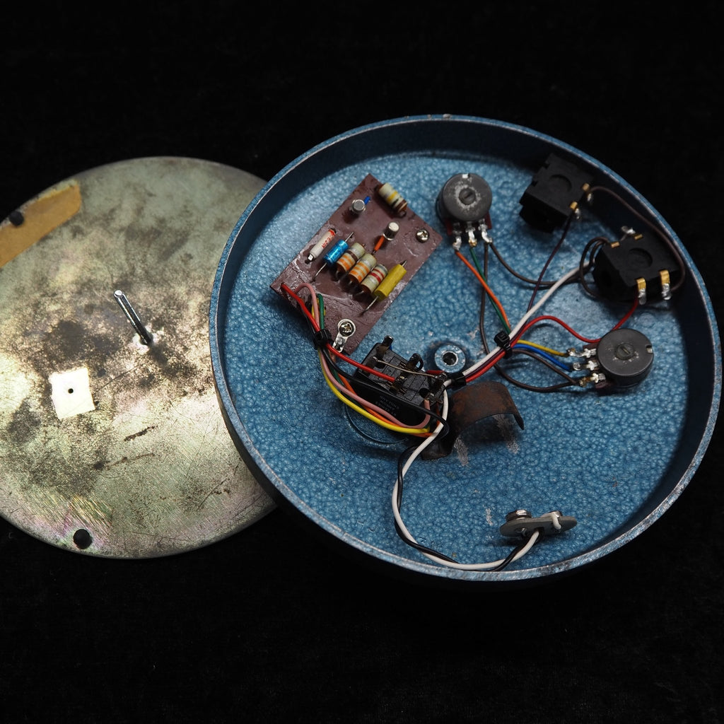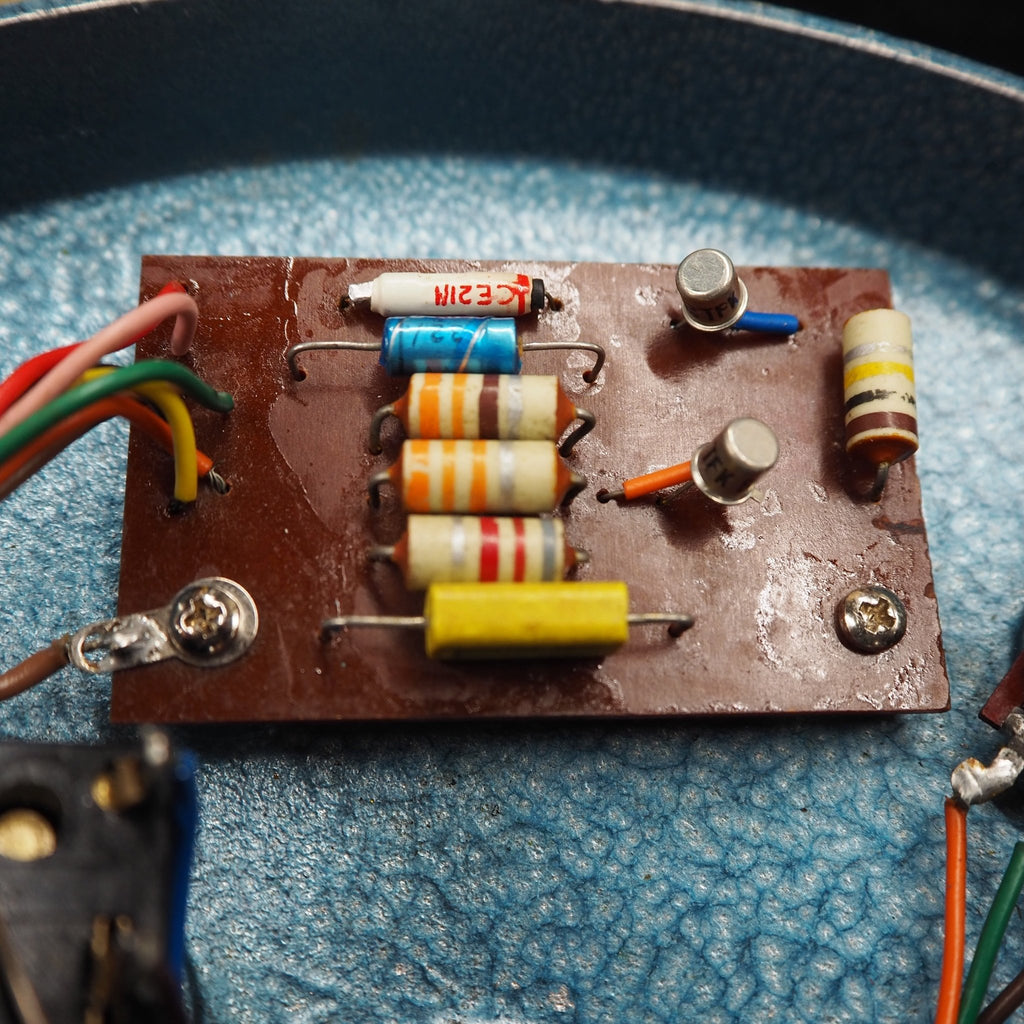 1966年後半に登場したファズフェイスは、当初PNPゲルマニウムトランジスタNKT275を採用しましたが、1960年代末にNPNシリコントランジスタBC108(他にBC109、BC183L等も確認されている)に仕様変更されています。また、筐体やカラーにもいくつかのバリエーションが見られます。1968年にはアービター社とレンジマスターで知られるダラスミュージック社との合併により、"DALLAS-ARBITER・ENGLAND"名義となります。さらに1975年にはCBSによって買収されています。本機は、"DALLAS-ARBITER・ENGLAND"名義の1960年代末〜1970年代初期の個体と推測されます。本品は残念ながら後年のTELEFUNKEN BC108Cへ交換されています。シリコントランジスタBC108はNKT275仕様に比べてゲインに余裕を持ち、FUZZコントロールを徐々に上げると、それはそれは太く迫力のあるサウンドを持っています。本品はトランジスタの交換がありますが、それらしいオリジナルと遜色のない素晴らしいサウンドを持った個体です。