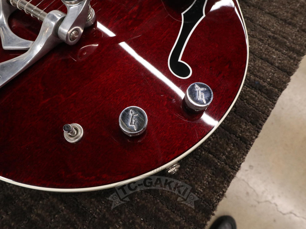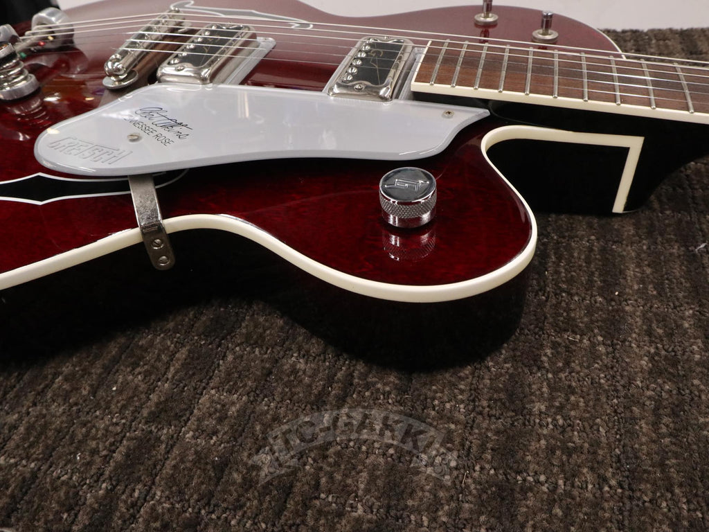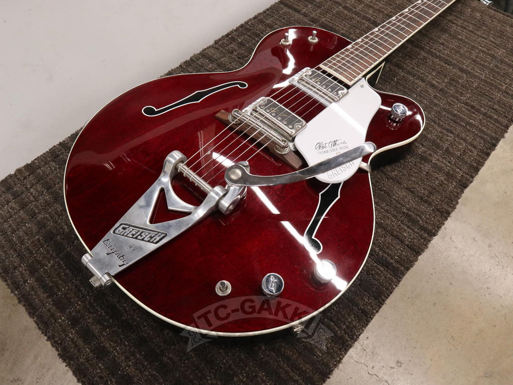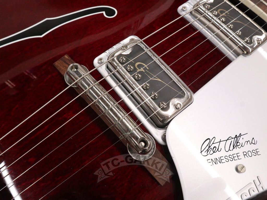 2009年製 GRETSCH G6119-1962HT は、1962年製テネシー・ローズを忠実に復刻したモデルで、まさにグレッチらしさの核心を体現した一本です。1958年に6119テネシアンとして誕生し、後にテネシー・ローズと名を変えたこのモデルは、チェット・アトキンスの名曲に由来する由緒正しい存在。16インチの完全ホローボディ構造により、空気感をしっかりと含んだ生鳴りを持ち、1950年代後半に登場したハイロートロン・ピックアップが、ブライトで抜けの良い高音域と、温かみがありながら締まりのある中低音を生み出します。