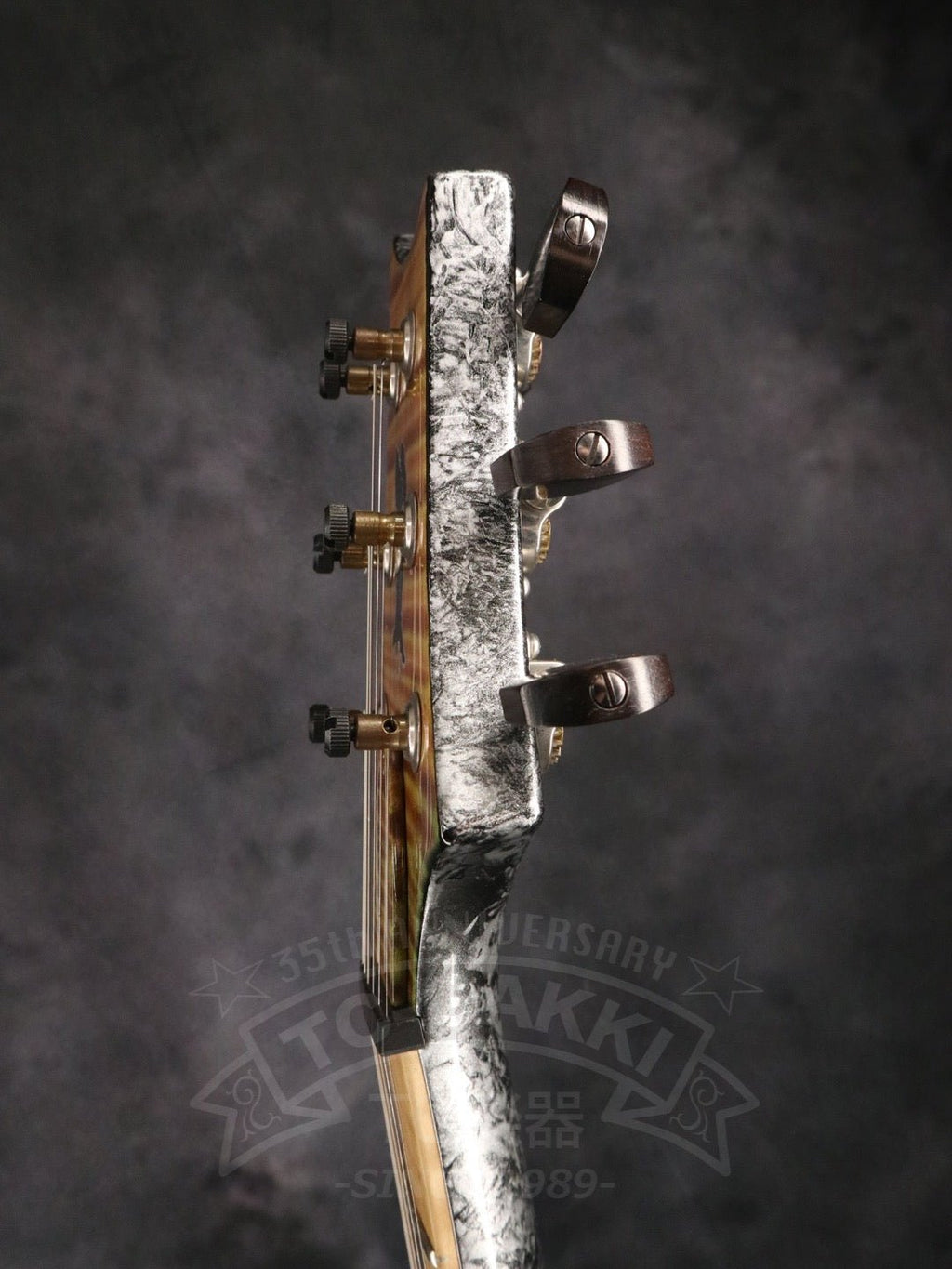 今回入荷したPrivate Stockは、ニトロセルロースとアクリルのハイブリッド塗装のV12でフィニッシュがされ、トップ面はグリーンカラーが褪色したナチュラルカラー、バック面はフォイル加工の施されたシルバー/ブラックのメタリック塗装となっており、オールドと現代的な煌びやかさを両立した見た目となっています。