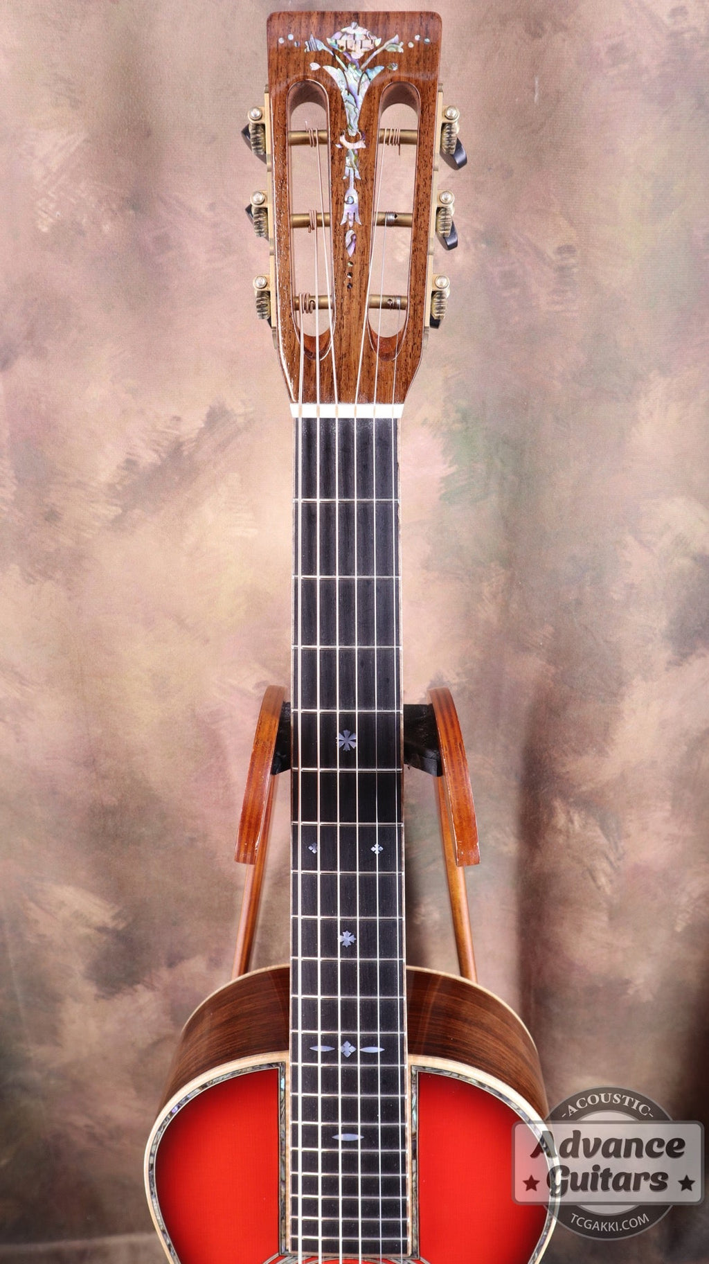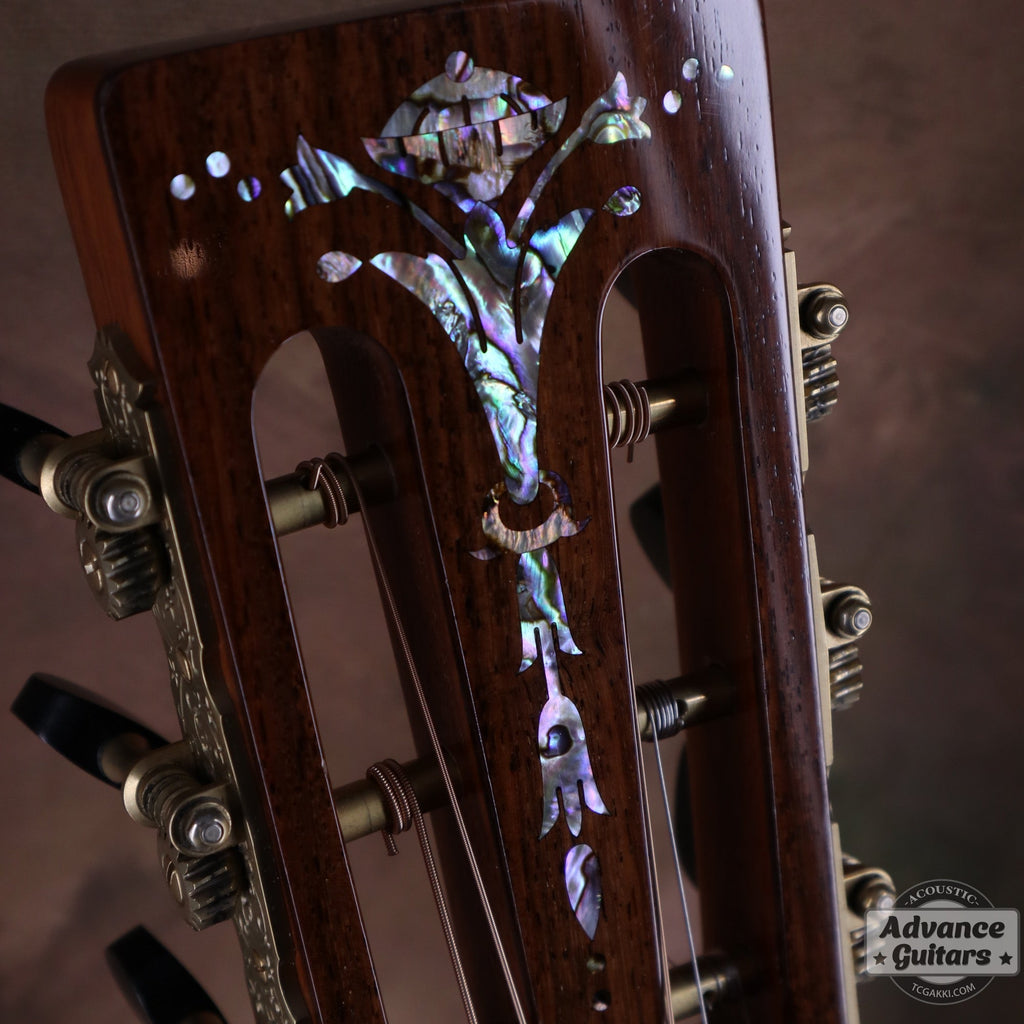 外観もまたこだわり抜かれています。 オールラッカーのサンバーストフィニッシュに、アバロントリム、スタイル42のスノーフレイクとキャッツアイインレイ、そしてヘッドのトーチインレイ。 見るたびに所有の喜びを感じさせる、品格のある佇まいです。