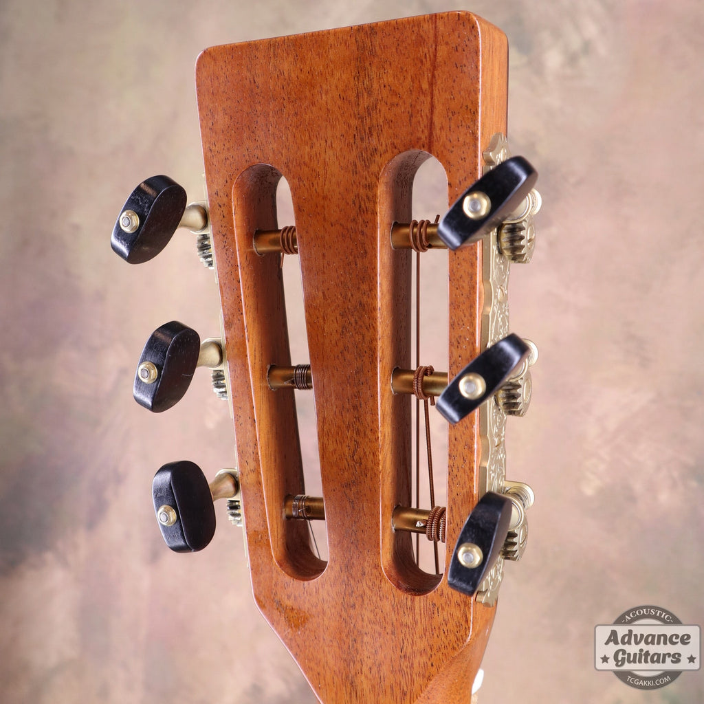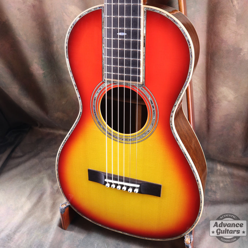小ぶりなボディを構えた瞬間、まず感じるのは軽さと取り回しの良さ。 しかし、ひとたび音を出した瞬間、その印象は裏切られます。 一音目から芯が太く、基音がしっかりと立ち上がり、音が空間に密度を持って広がっていく。 パーラーサイズとは思えない情報量と、ジャーマントップ特有の繊細さ、ローズウッドの深い倍音が重なり合い、まるで大きなギターを凝縮したような響き方をします。