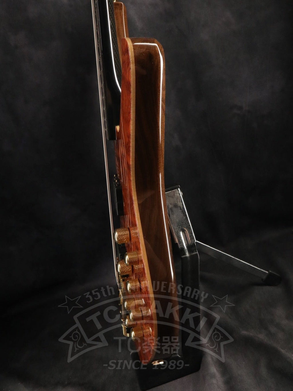 本機はボディバックにWalnut、ボディトップにKevasingo(ブビンガ)が用いられており、エキゾチックな杢目が特徴的なルックスです。